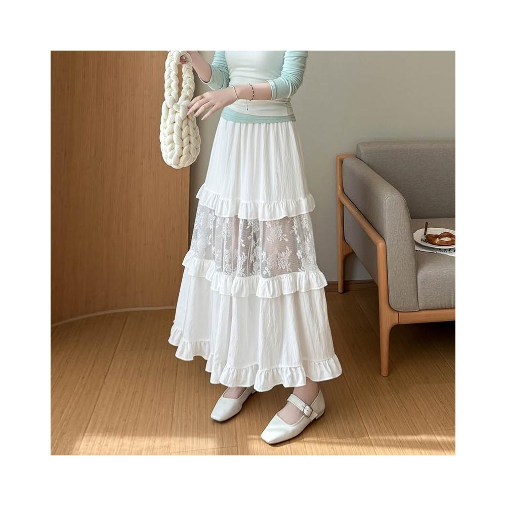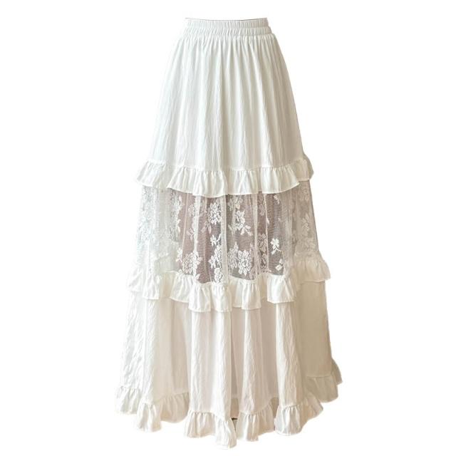 素行紀元白色中長款半身裙女2026春夏新款蕾絲拼接木耳邊a字蛋糕裙長裙