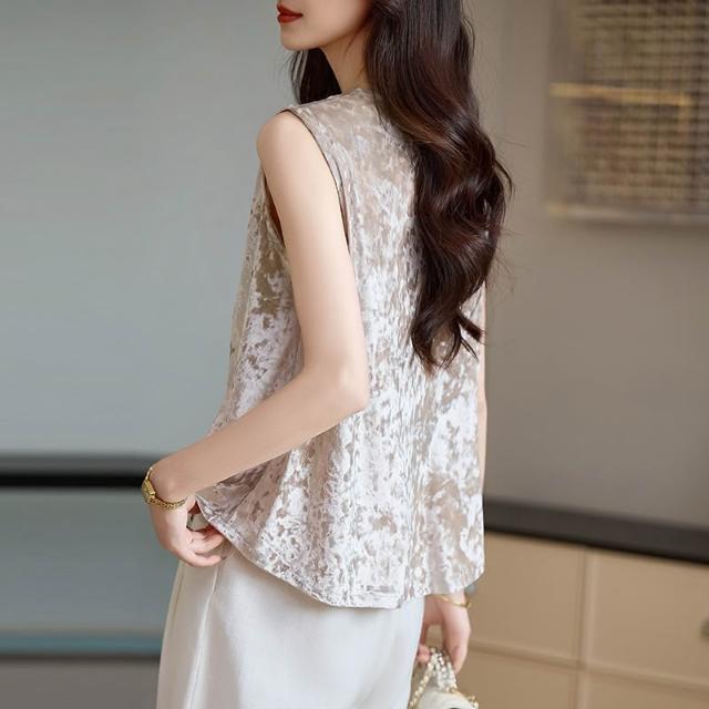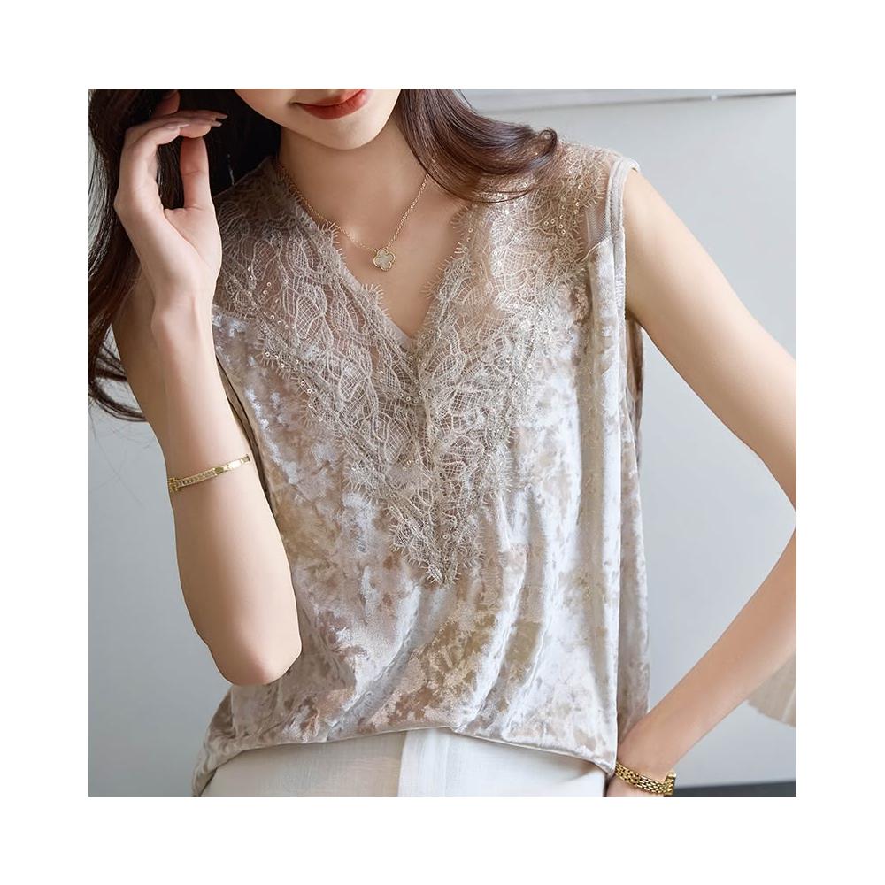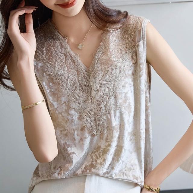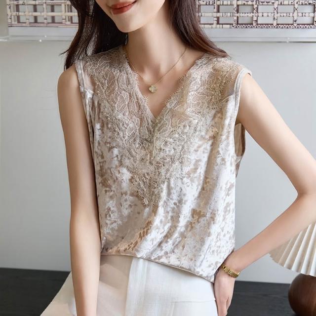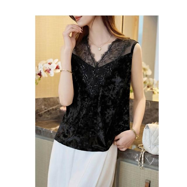 素行紀元v領純色真絲絲絨背心女桑蠶絲亮片蕾絲性感無袖打底衫上衣H