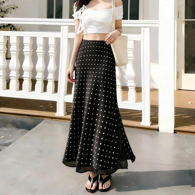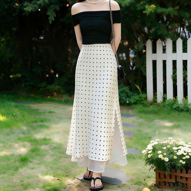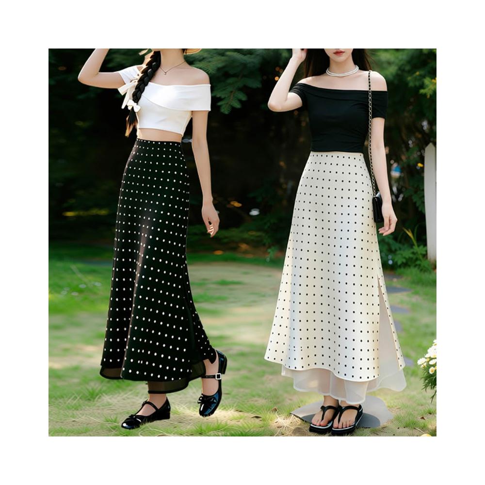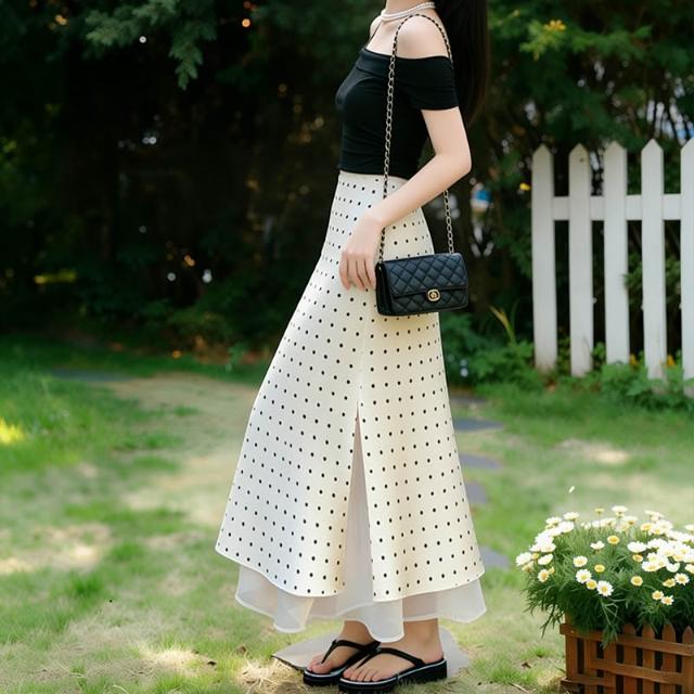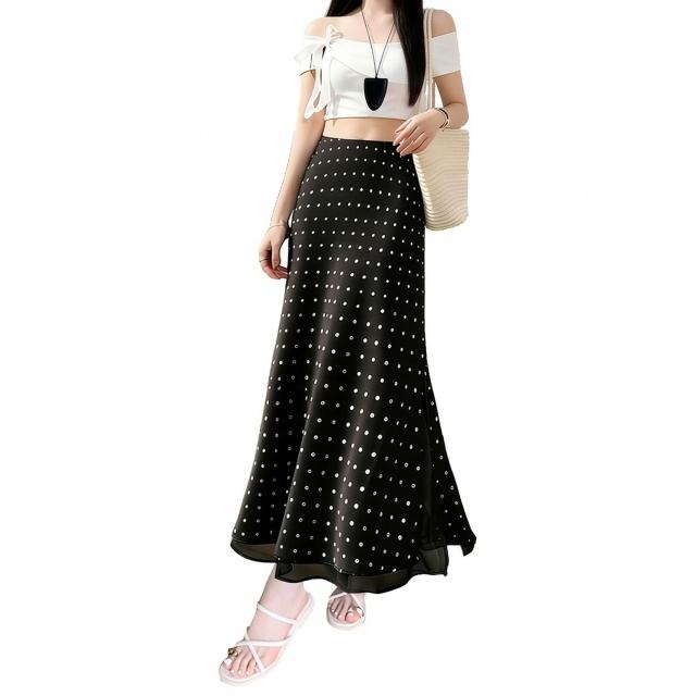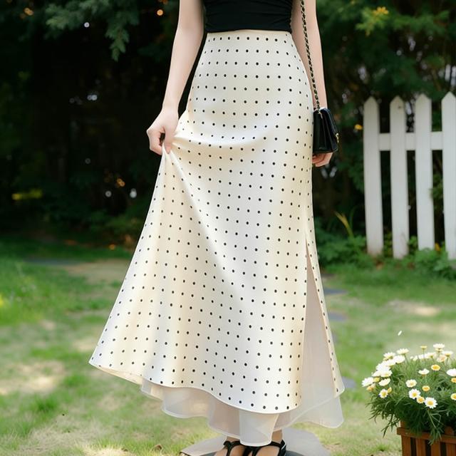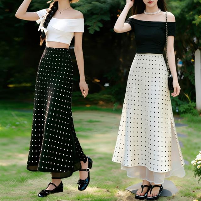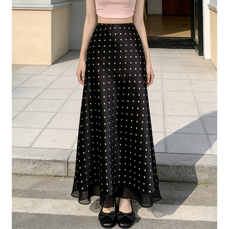 免運免稅素行紀元 2026春夏新款法式高級感杏色波點緞面半身裙顯瘦網紗拼接A字長裙