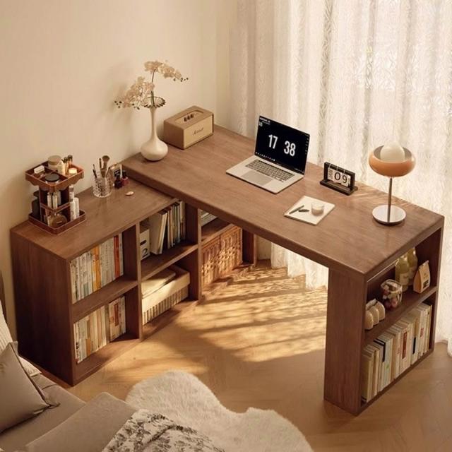 轉角書桌臥室梳粧檯型拐角電腦桌子實木可旋轉書架書櫃一體桌子