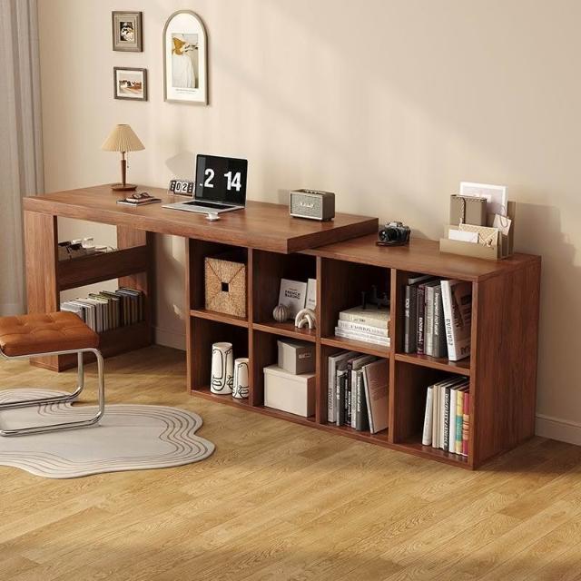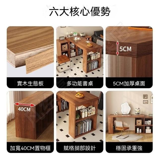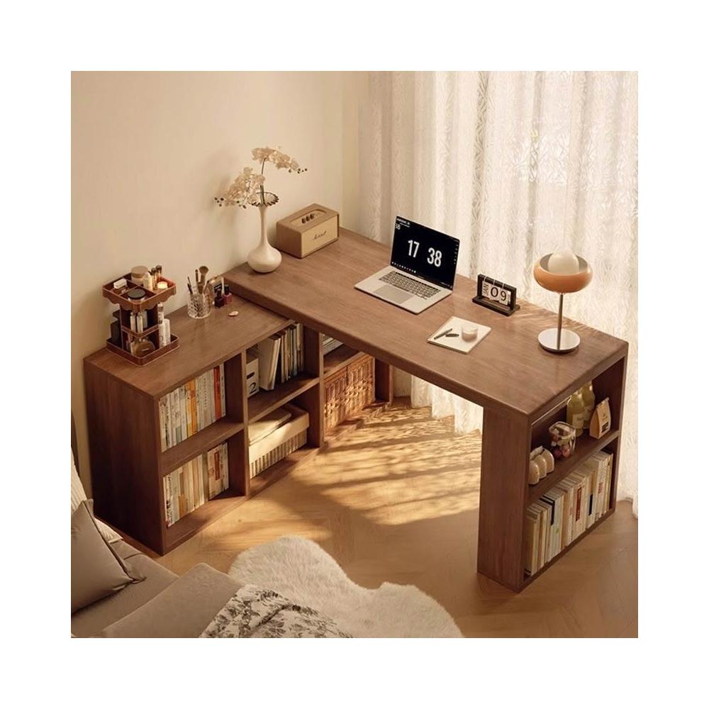 轉角書桌臥室梳粧檯型拐角電腦桌子實木可旋轉書架書櫃一體桌子