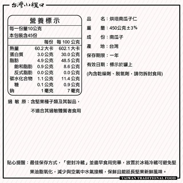 台灣小糧口烘焙南瓜子仁 450g*1罐