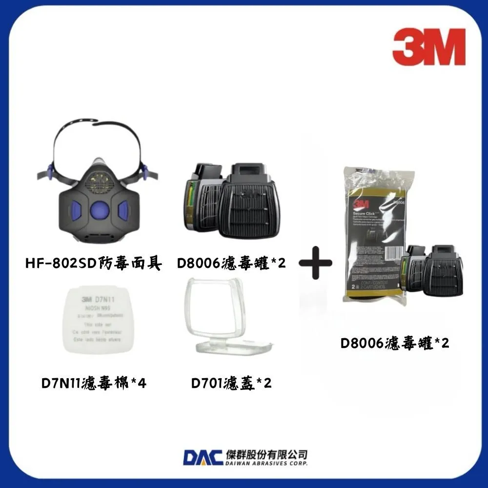 3M【五一勞動節限定組合】 3M HF-802SD 防毒面具濾毒套組 (半面體,通話瓣膜,快拆雙罐式 D8000)