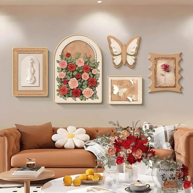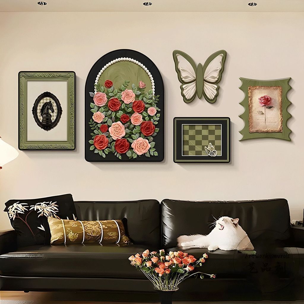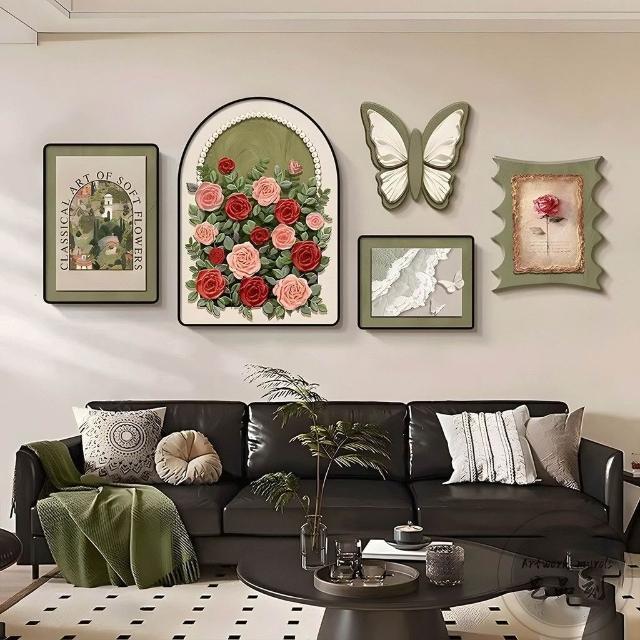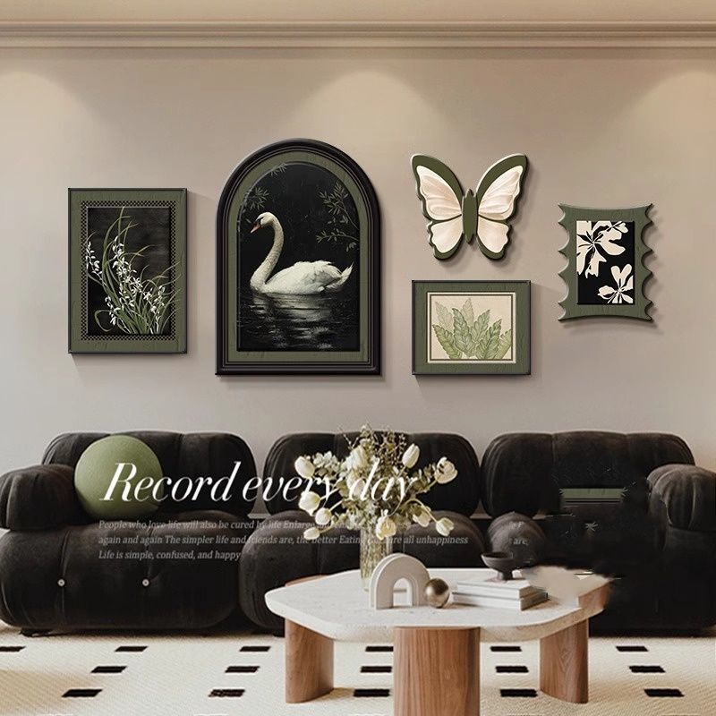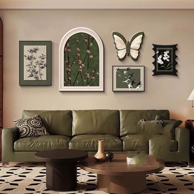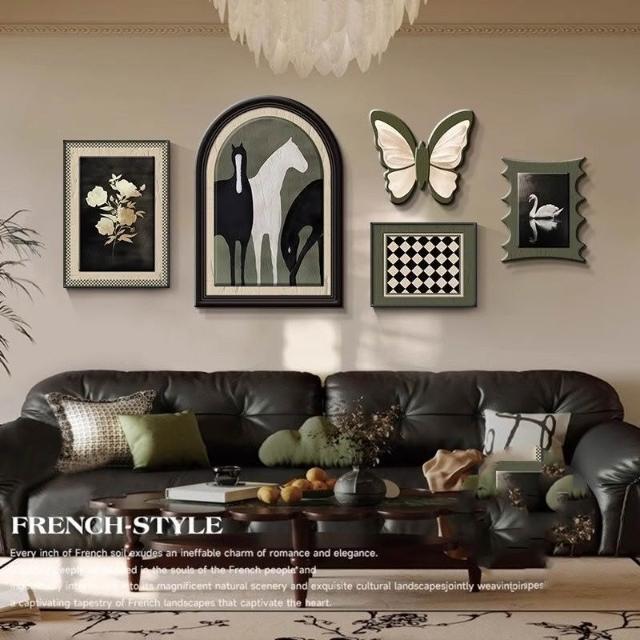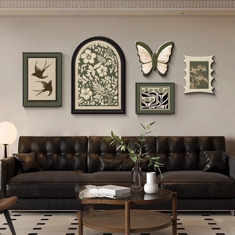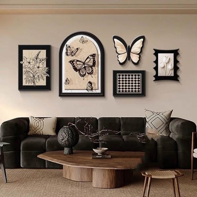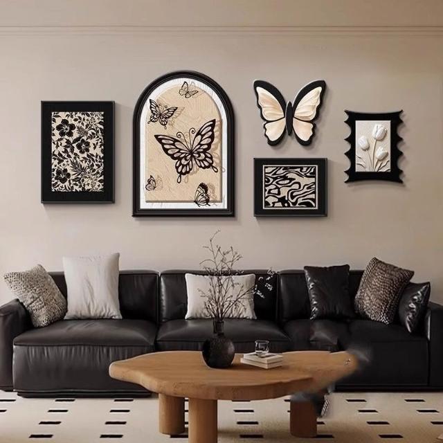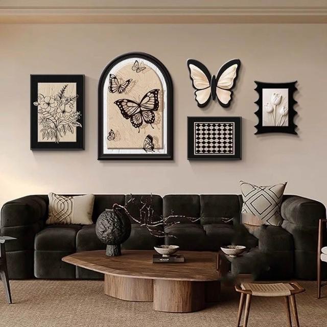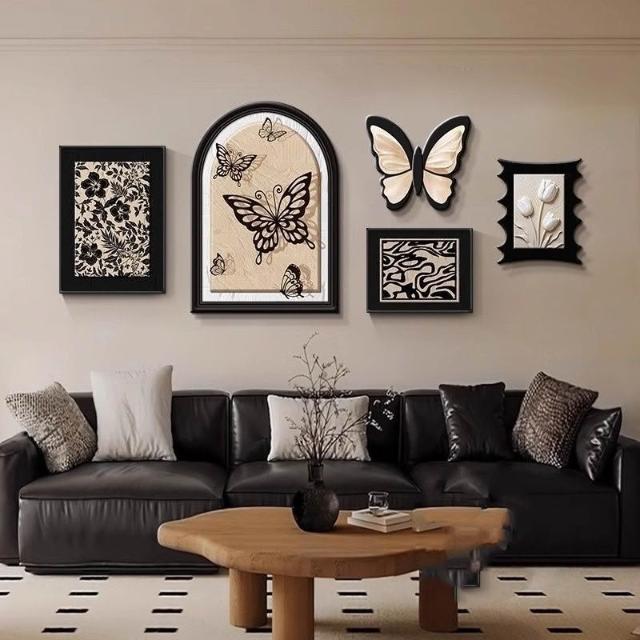 掛畫創意組合+高端水晶瓷+PVC邊框法式中古風客廳裝飾畫 蝴蝶高級感沙發背景墻掛畫 復古藝術組合壁畫 墻壁裝飾