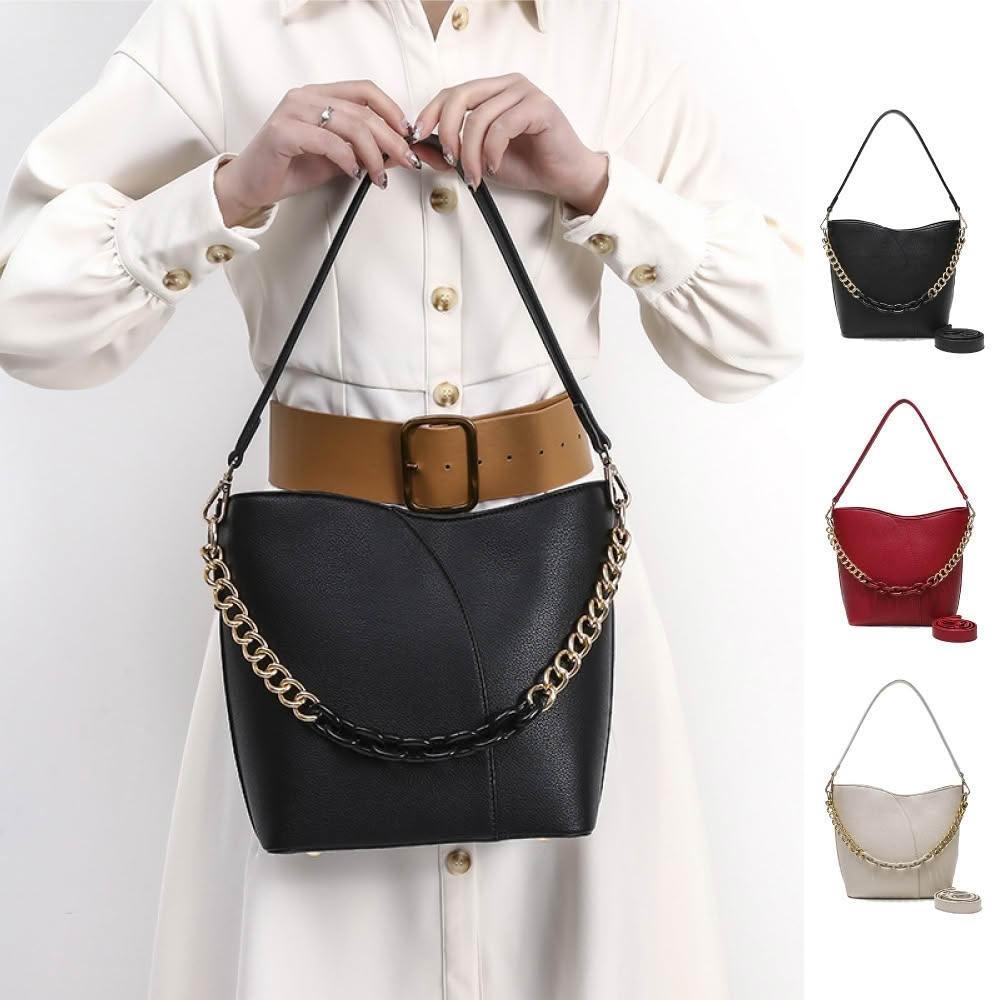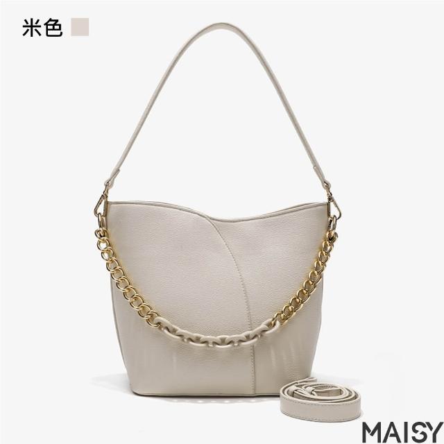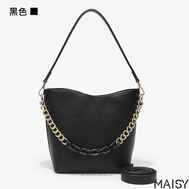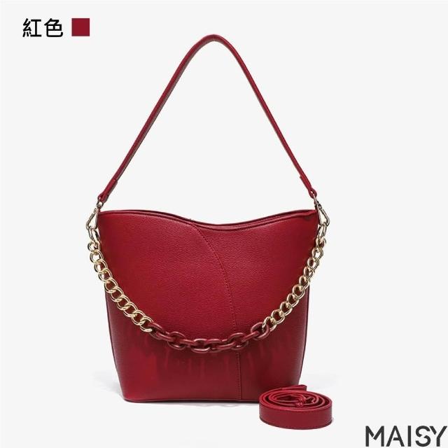 MAISY質感典雅純色大容量鍊條水桶包 肩背包 斜背包(黑色/米色/紅色)