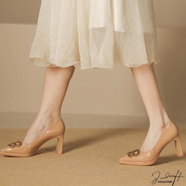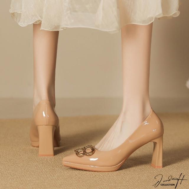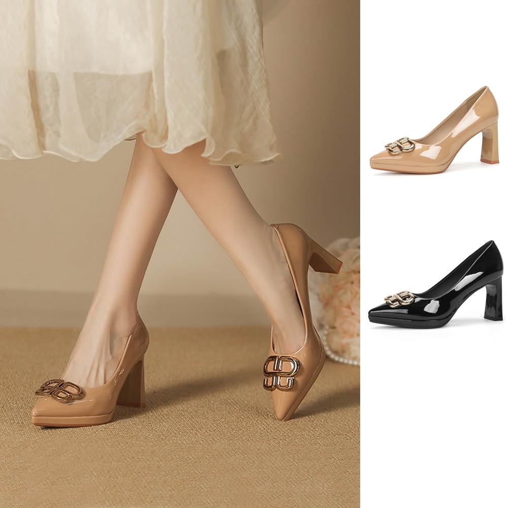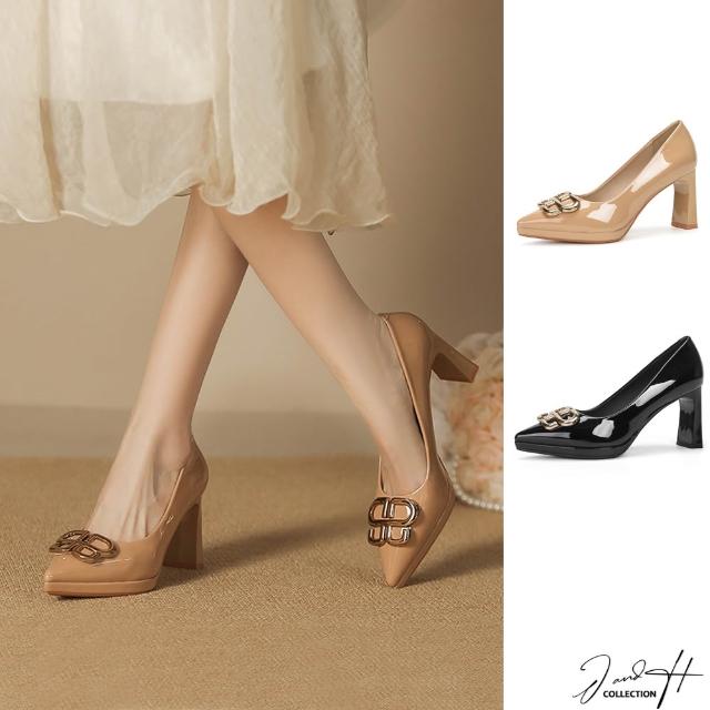 J&H collection性感尖頭漆皮粗跟女鞋 高跟鞋(奶茶色 / 黑色)