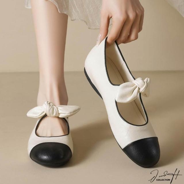 J&H collection圓頭拼色蝴蝶結平底女鞋 瑪莉珍鞋(杏色 / 黑色)