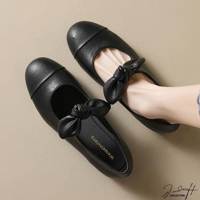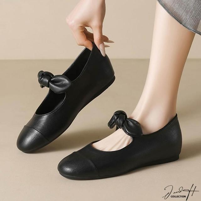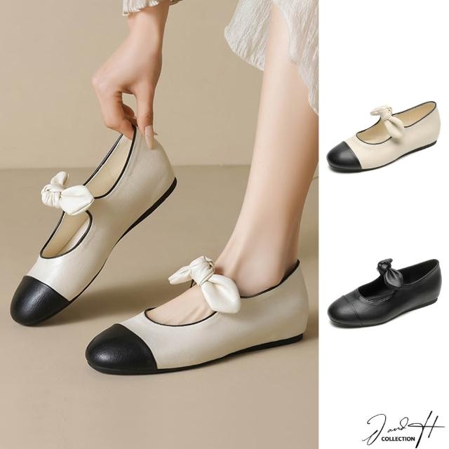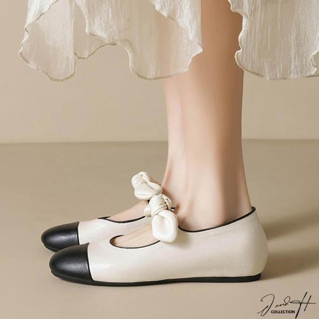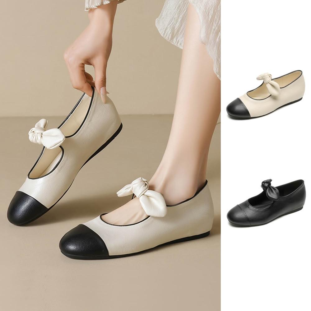 J&H collection圓頭拼色蝴蝶結平底女鞋 瑪莉珍鞋(杏色 / 黑色)