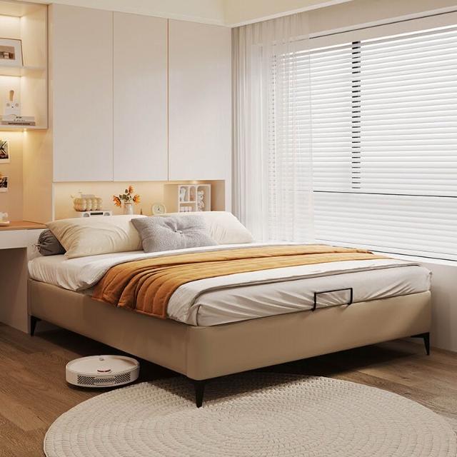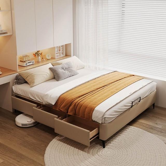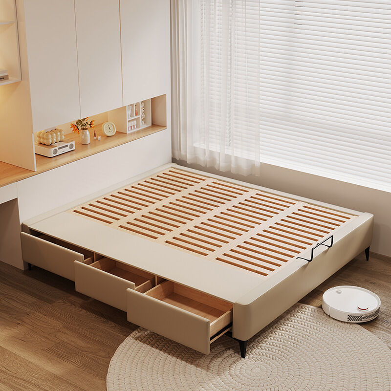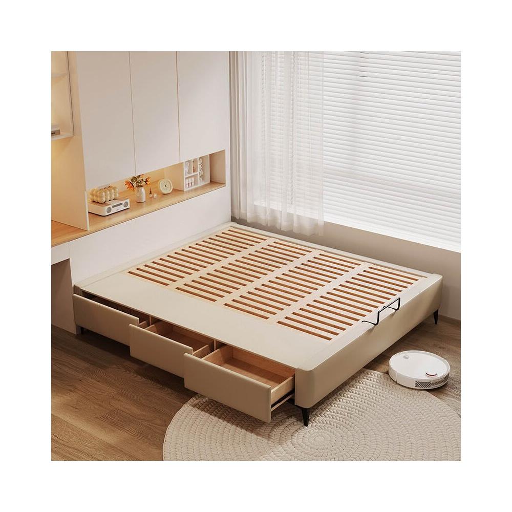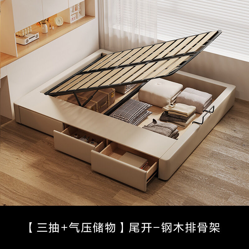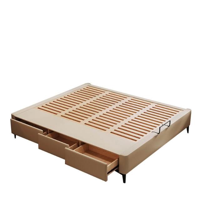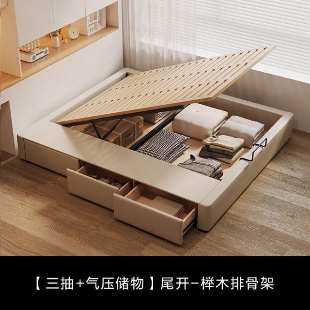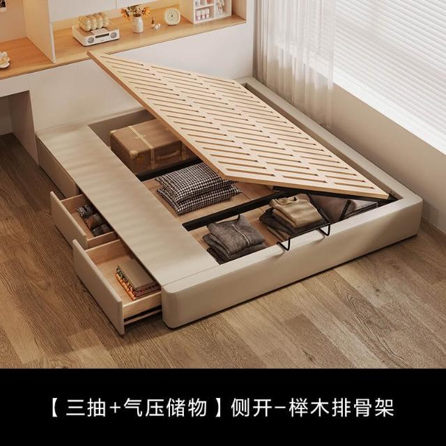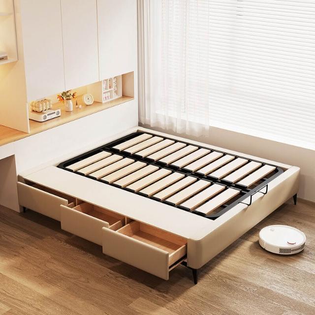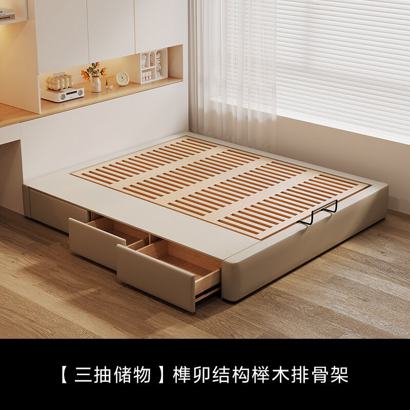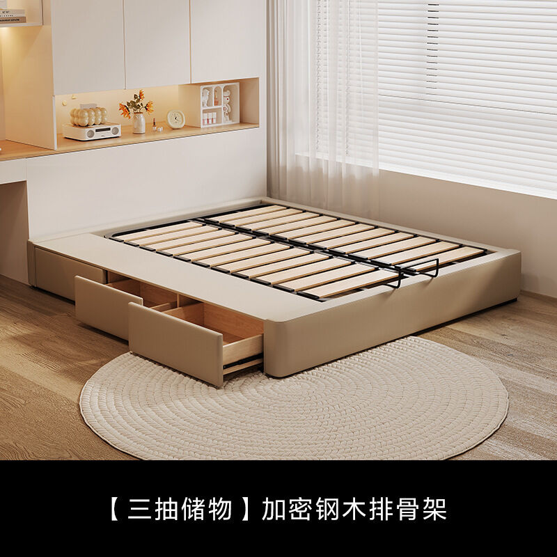 意式極簡無床頭床現代輕奢小戶型榉木排骨架實木抽屜床兒童皮藝床