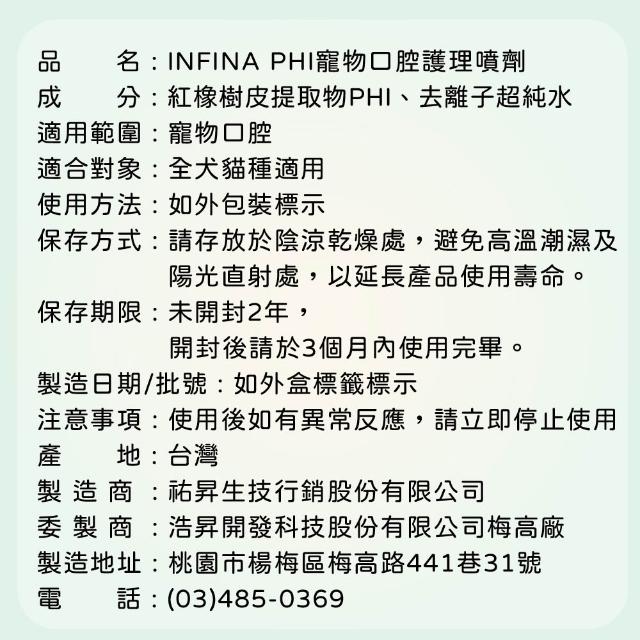 INFINA 茵飛納PHI寵物口腔護理噴劑 清新口氣噴霧 日常口腔清潔 清爽保養呵護愛寵 貓狗適用