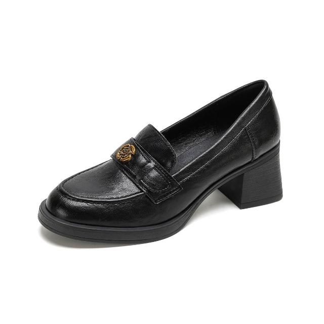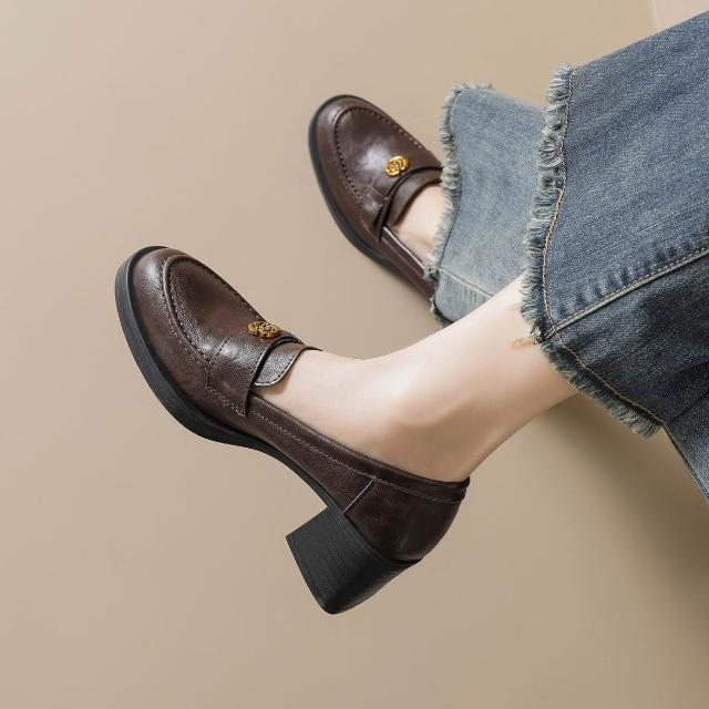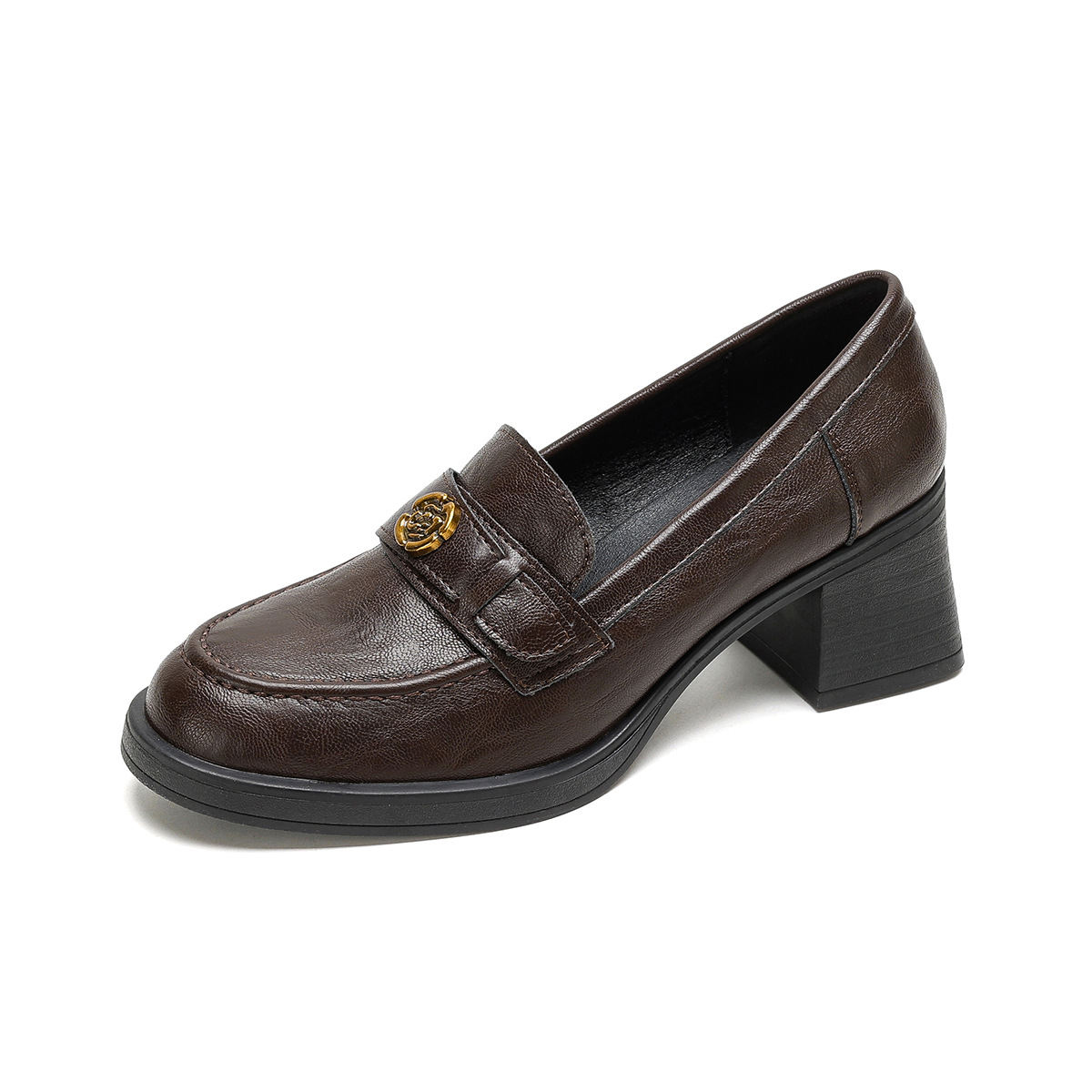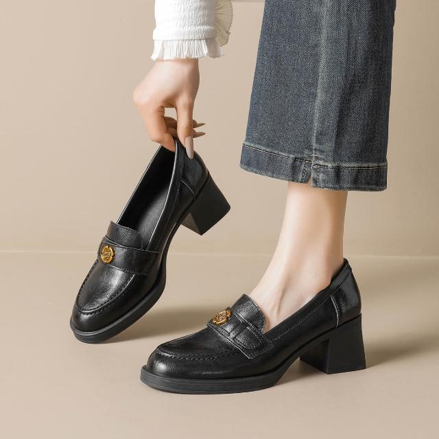 LIORA(莱奥拉)國際女鞋 高跟樂福單鞋女山茶花復古一腳蹬厚底粗跟小皮鞋
