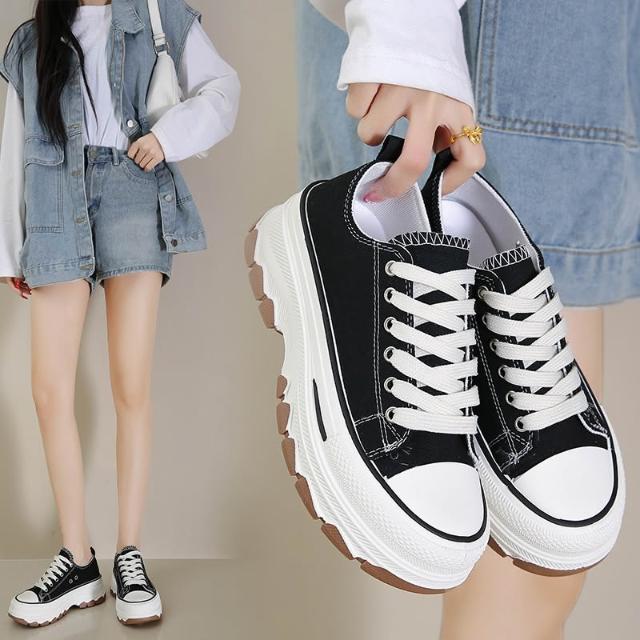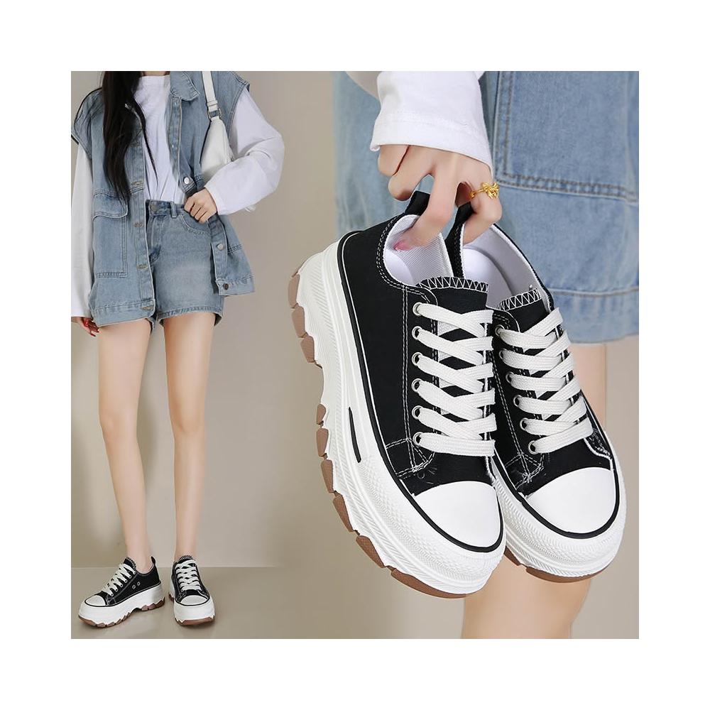厚底帆布鞋女款2024年夏季新款增高鞋子黑色小眾松糕休閑板鞋 LIORA(莱奥拉)國際女鞋