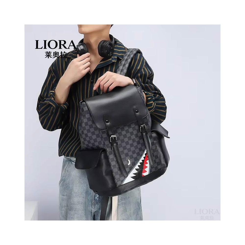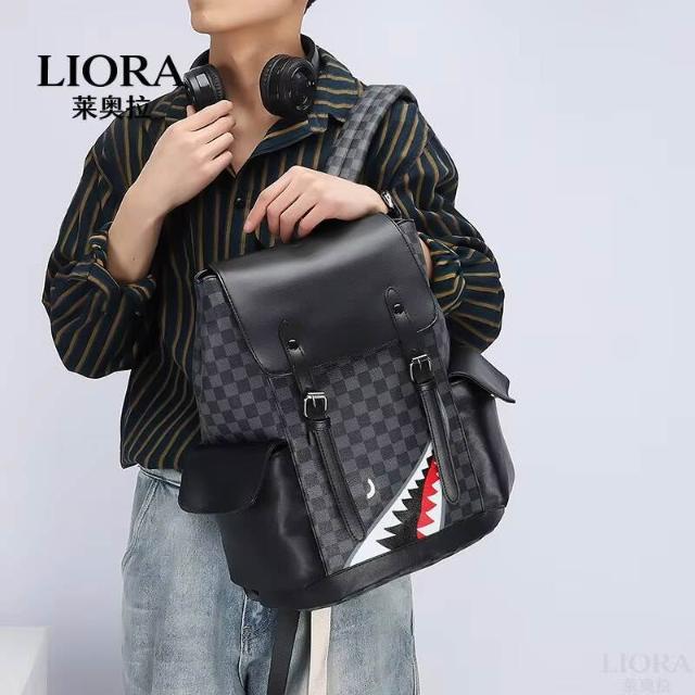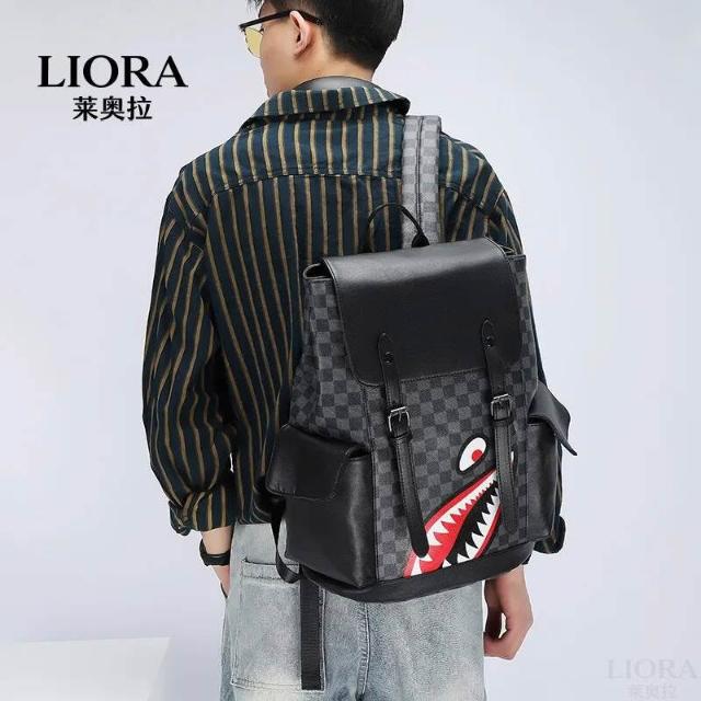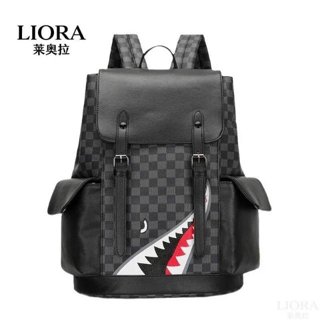 新款包包 潮牌復古鲨魚雙肩包春季新款PU男士休閑背包大容量多功能學生書包 LIORA(莱奥拉)