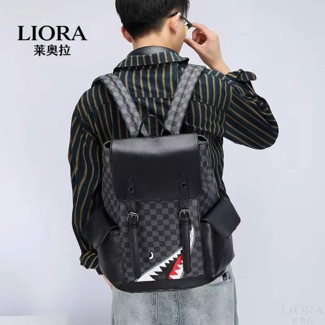 新款包包 潮牌復古鲨魚雙肩包春季新款PU男士休閑背包大容量多功能學生書包 LIORA(莱奥拉)