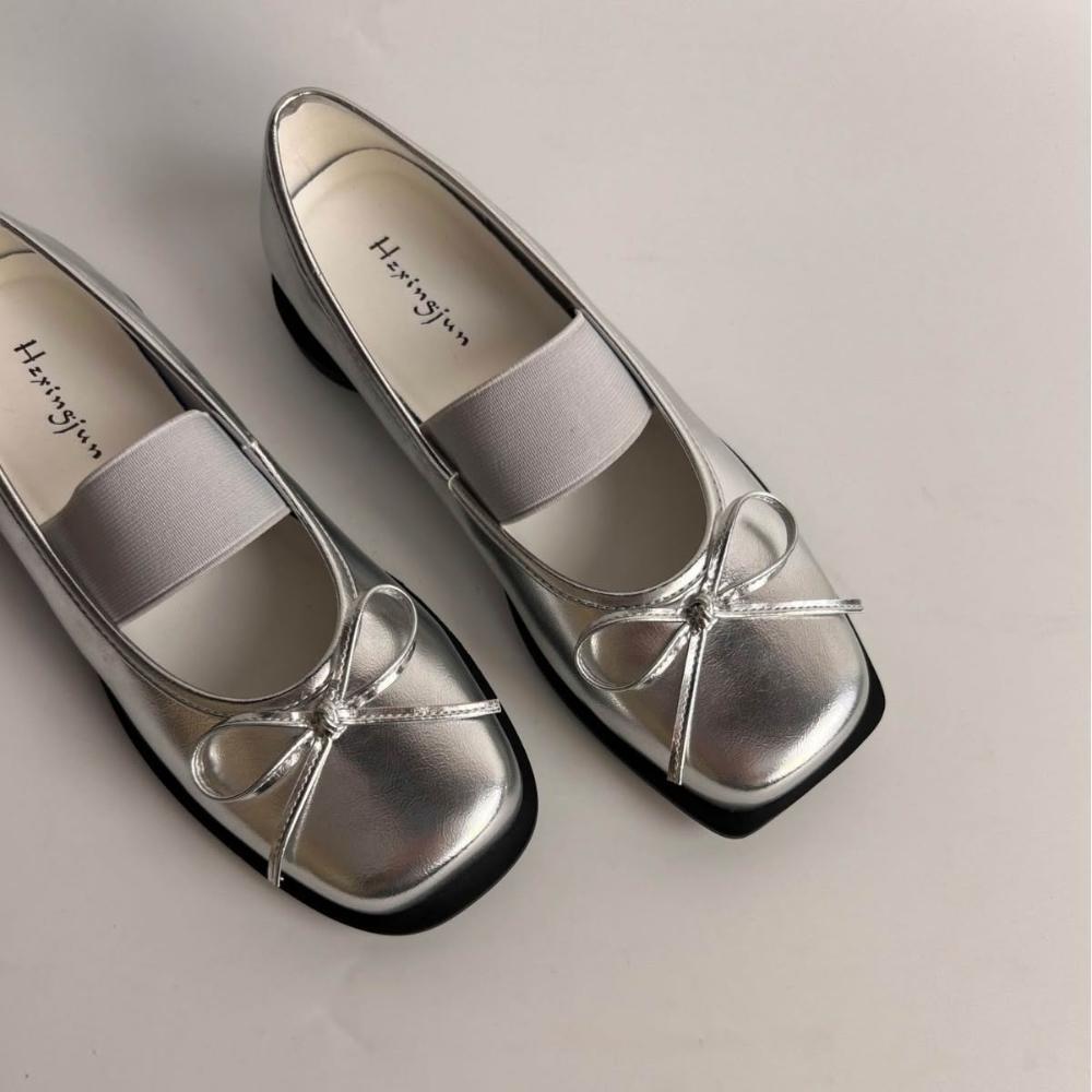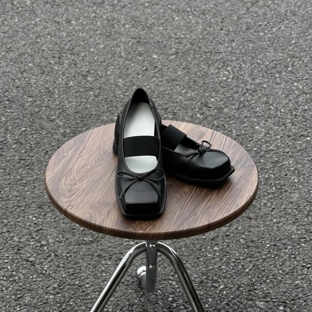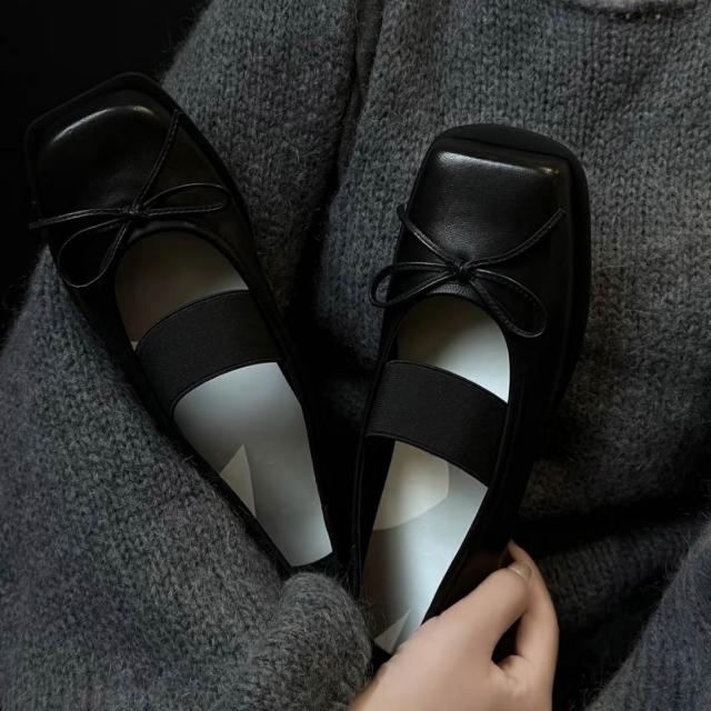 牛皮版~方頭淺口瑪麗珍鞋女新款蝴蝶結真皮單鞋芭蕾舞厚底小皮鞋 【莱奥拉旗舰店】