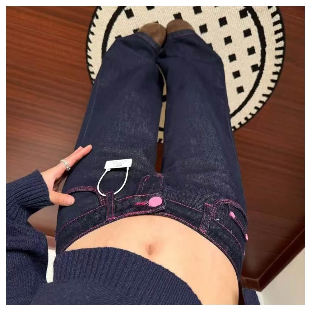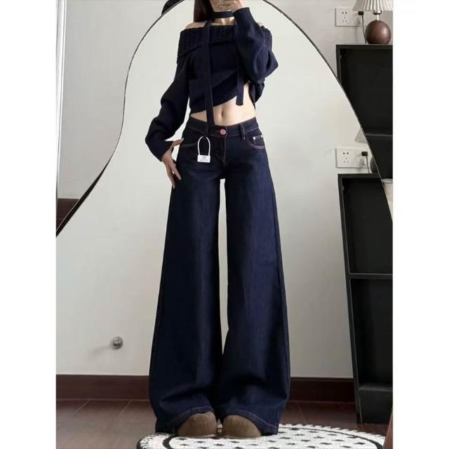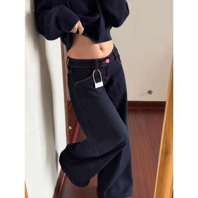 小個子美式辣妹撞色新款低腰闊腿牛仔褲女直筒寬松顯瘦垂感拖地褲