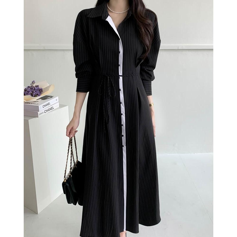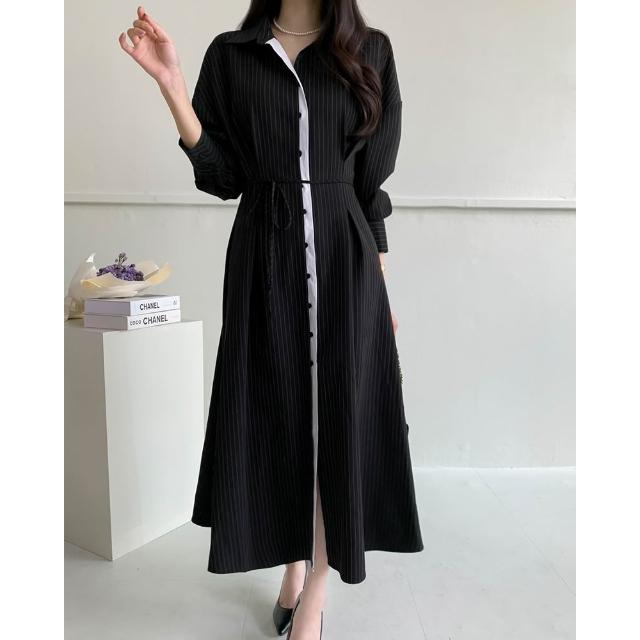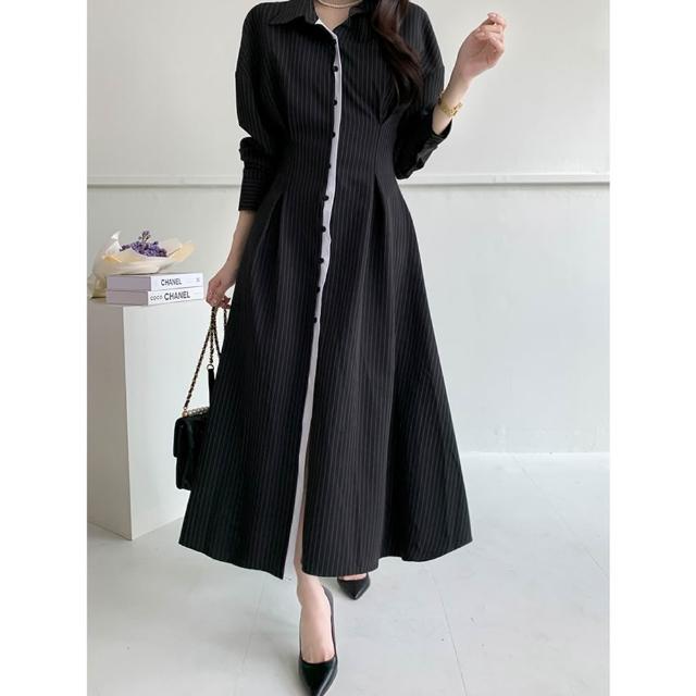 DAILY - MOOD 尺寸已更新 韓國chic 法式氣質撞色條紋收腰顯瘦系帶連衣裙