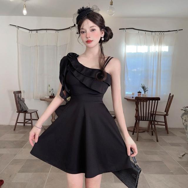 DAILY - MOOD 實拍仙女風單肩吊帶連衣裙女荷葉邊收腰 a 字裙溫柔風白色小短裙