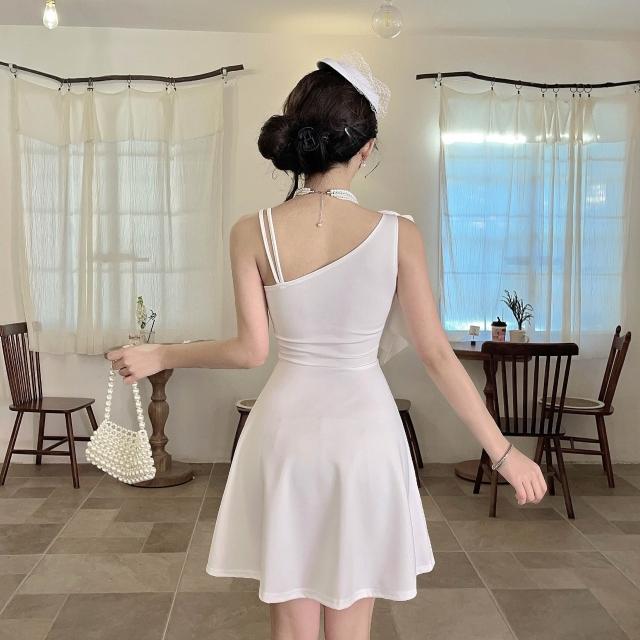 DAILY - MOOD 實拍仙女風單肩吊帶連衣裙女荷葉邊收腰 a 字裙溫柔風白色小短裙