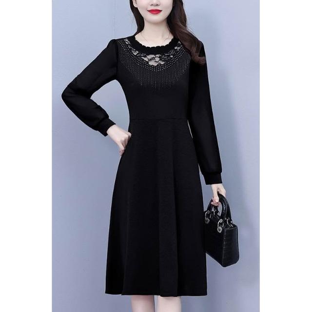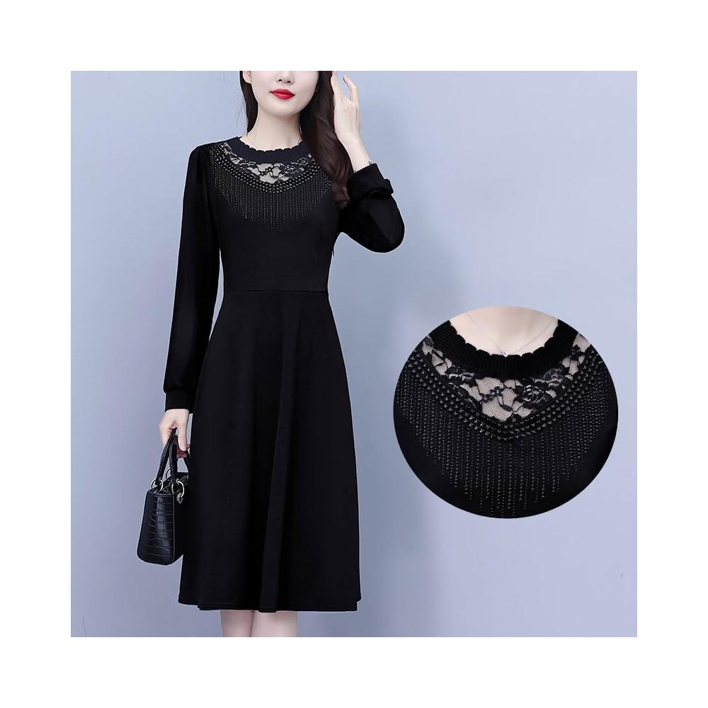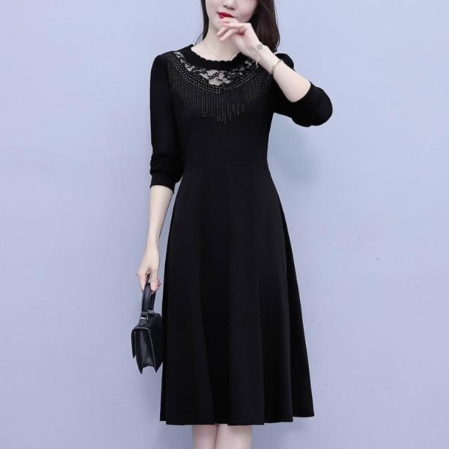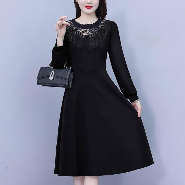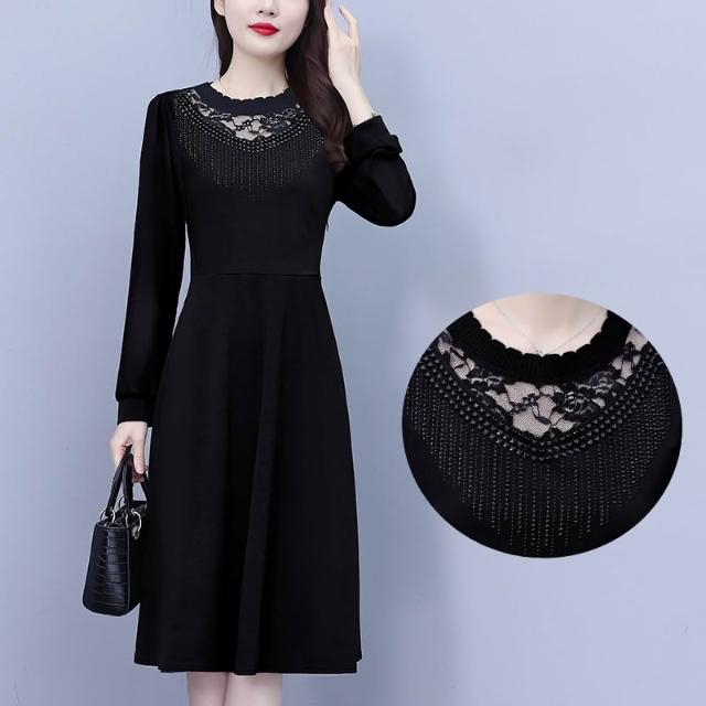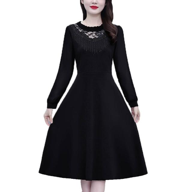 DAILY - MOOD 簡約黑色修身大碼女裝胖mm胖妹妹長袖中長款連衣裙春秋新款媽媽裝