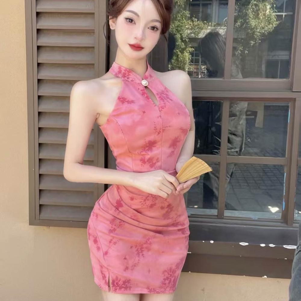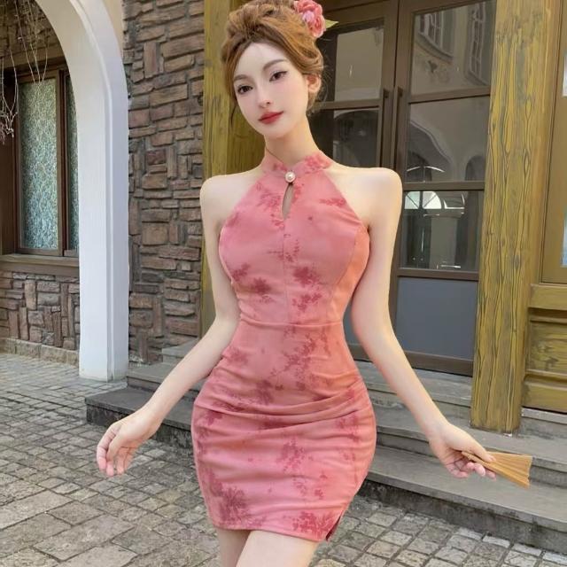 DAILY - MOOD 實拍新中式改良掛脖旗袍連衣裙女修身顯瘦復古氣質短款包臀裙