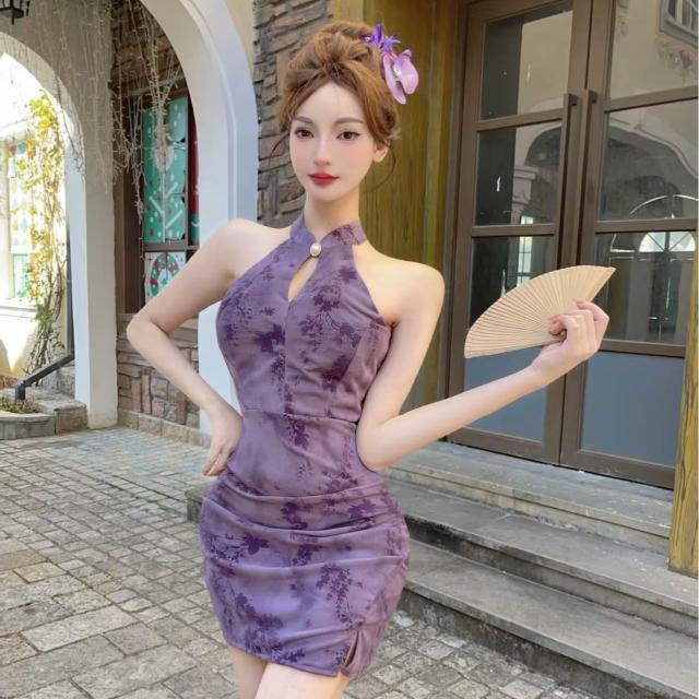 DAILY - MOOD 實拍新中式改良掛脖旗袍連衣裙女修身顯瘦復古氣質短款包臀裙