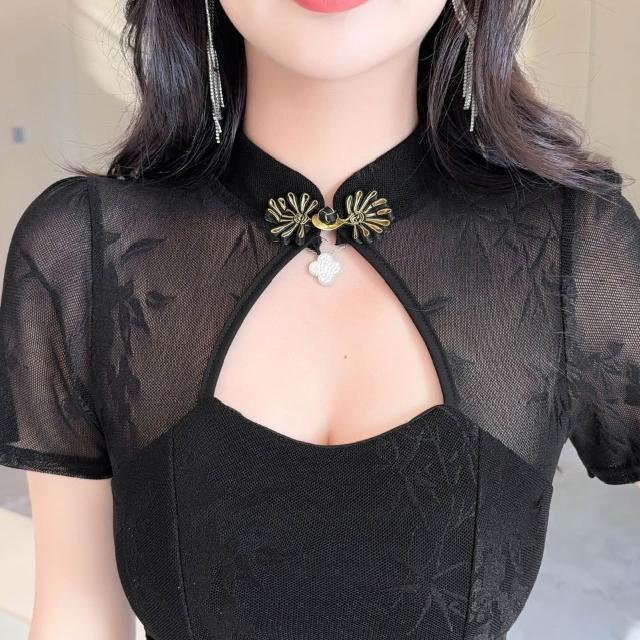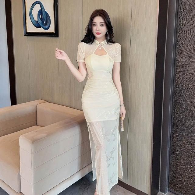 DAILY - MOOD 實拍改良版旗袍連衣裙女氣質名媛風收腰顯瘦長款開叉宴會禮服裙
