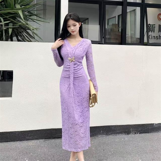 DAILY - MOOD 實拍性感風 V 領蕾絲連衣裙收腰中長裙約會出街顯瘦高級感裙子