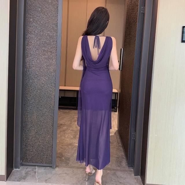 全店免税 免运 實拍性感 V領無袖連衣裙女修身顯瘦包臀裙設計感小眾宴會飄帶長裙