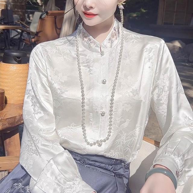 全店免關稅-DM 竹與鳥新中式國風襯衫上衣女2025早春新款刺繡提花桑蠶絲襯衣白色