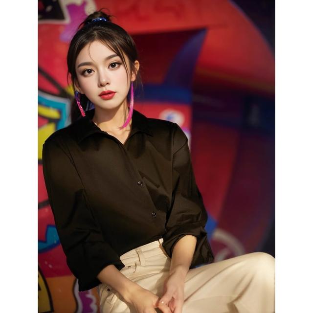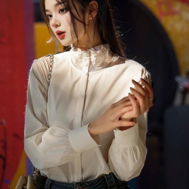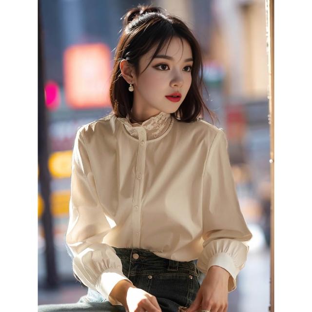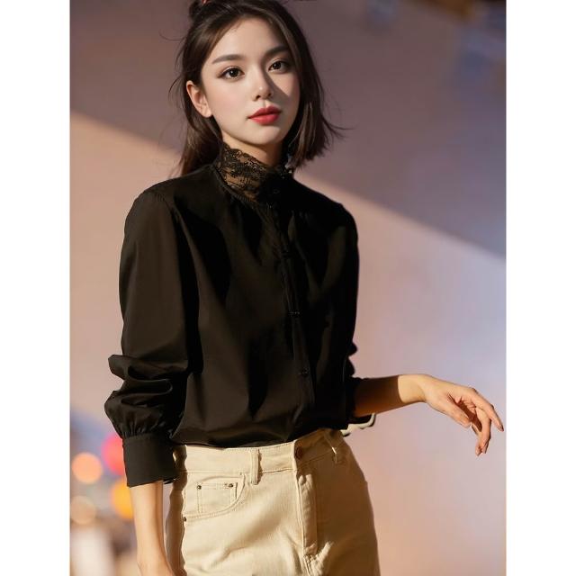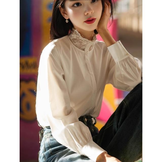 全店免關稅-DM 笑涵“白月光”優雅腔調蕾絲拼接領/舒適棉彈襯衫女2025春季