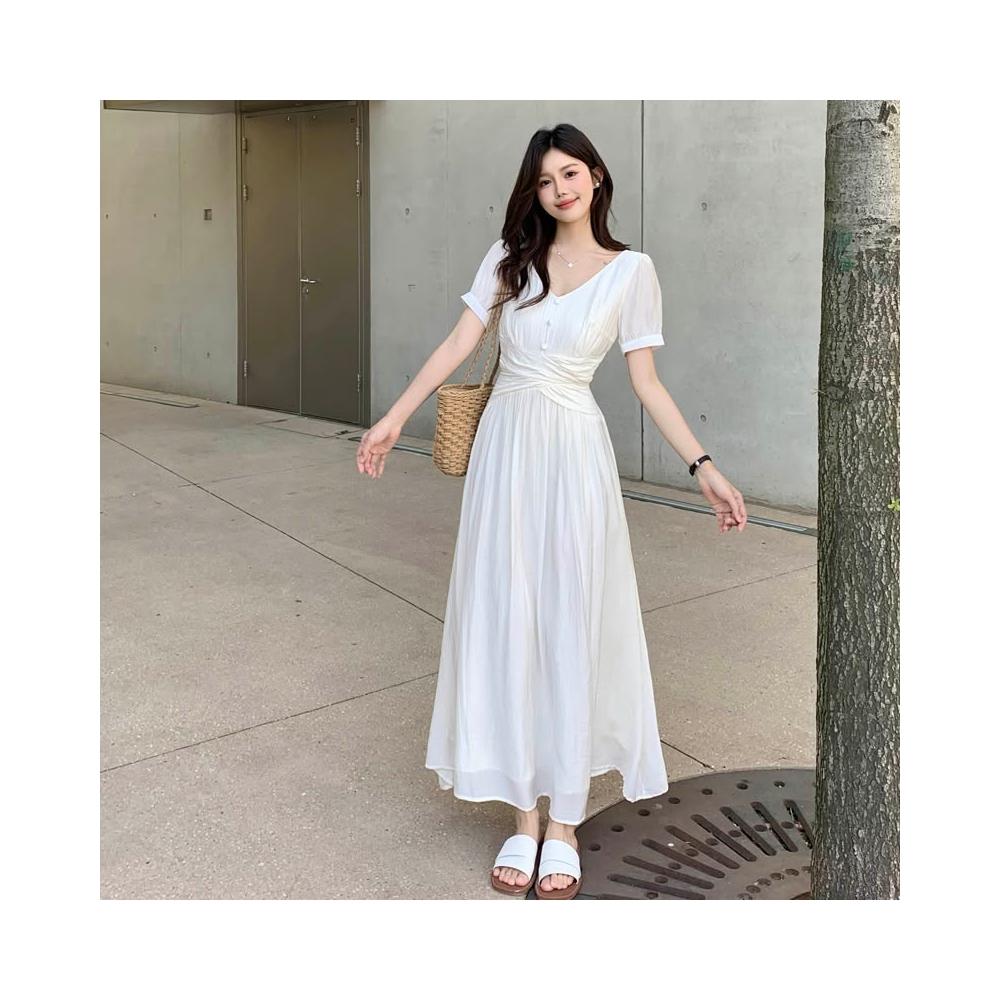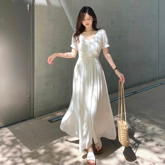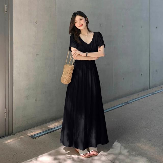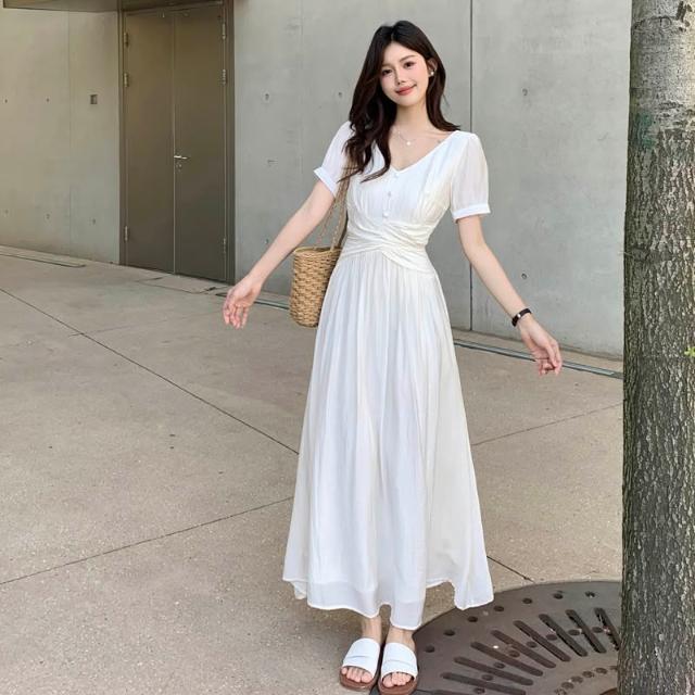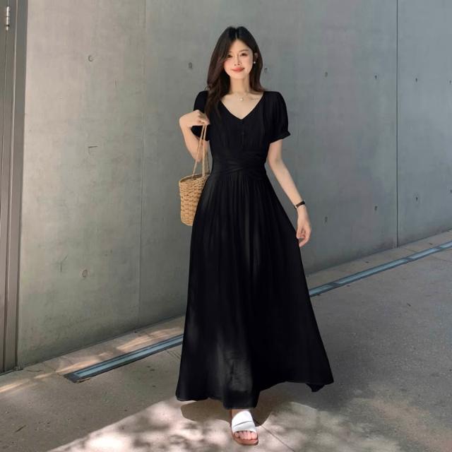 全店免關稅-DM 實拍~大碼法式茶歇溫柔氣質v領連衣裙女收腰顯瘦設計感沙灘長裙