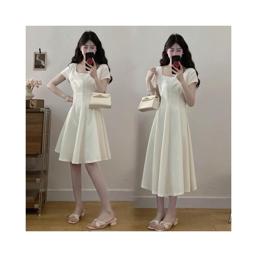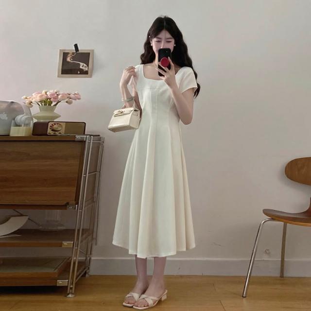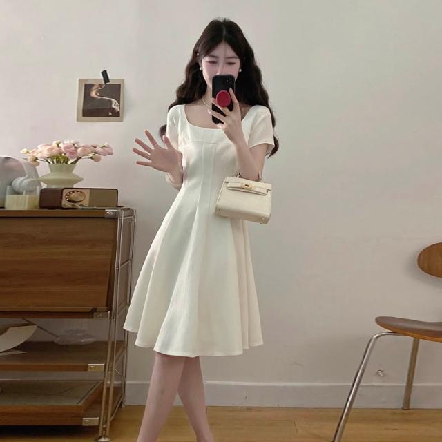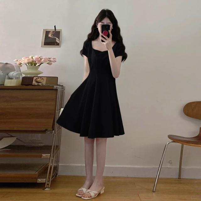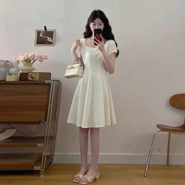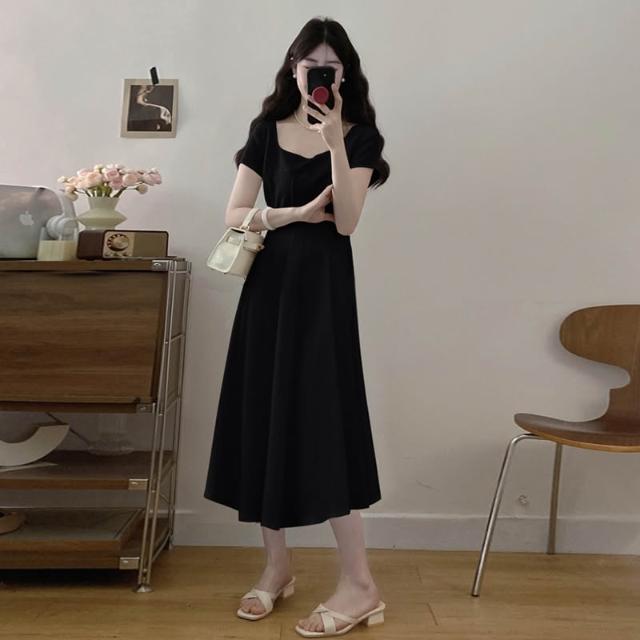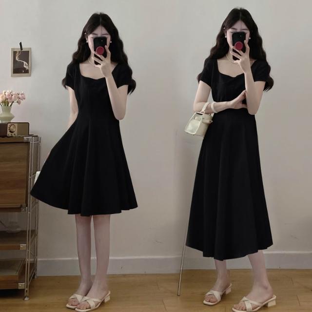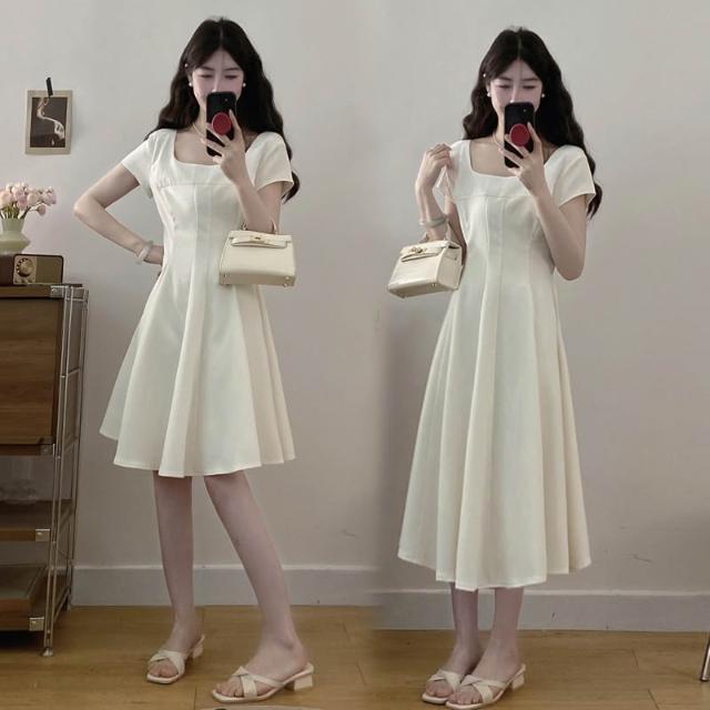 全店免關稅-DM 實拍~大碼女裝氣質法式方領連衣裙正式場合茶歇赫本風收腰顯瘦裙