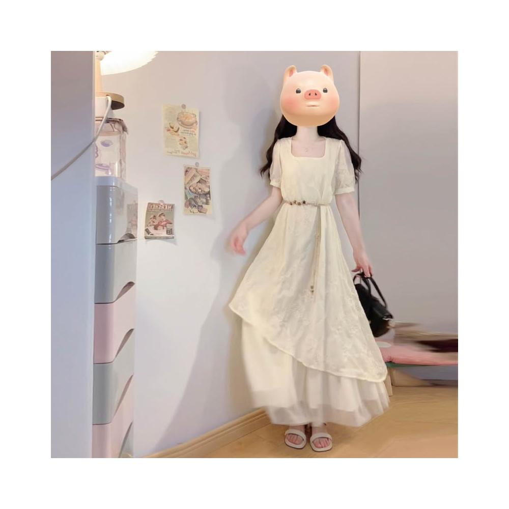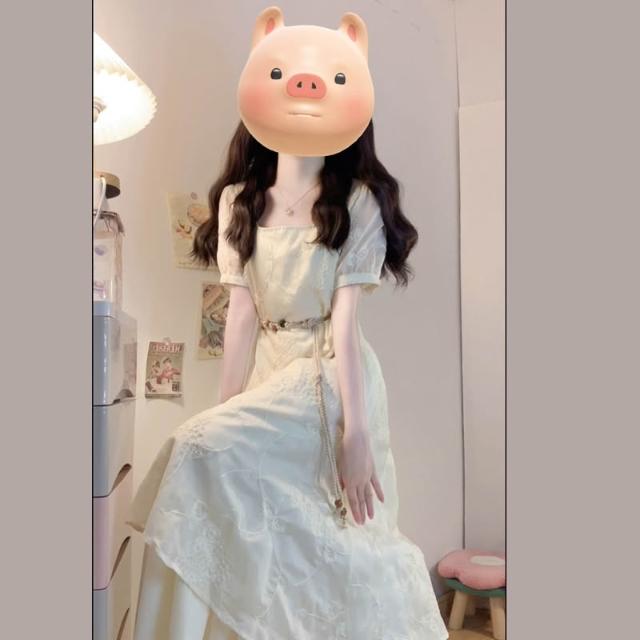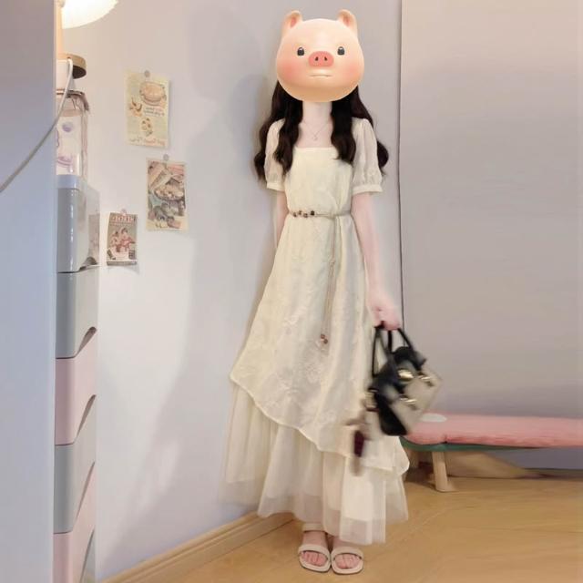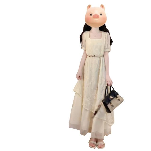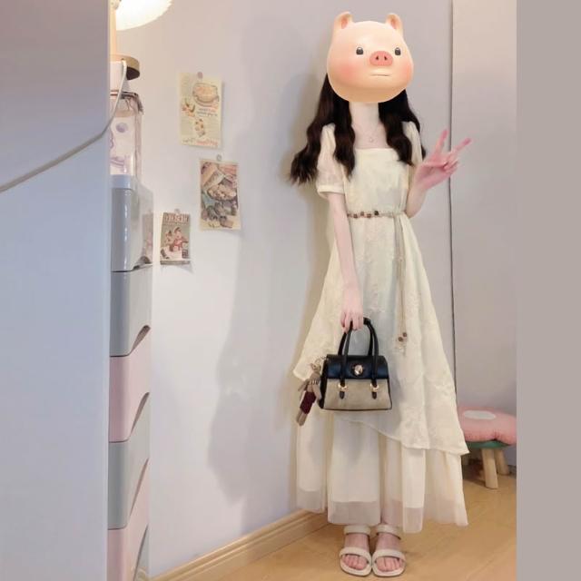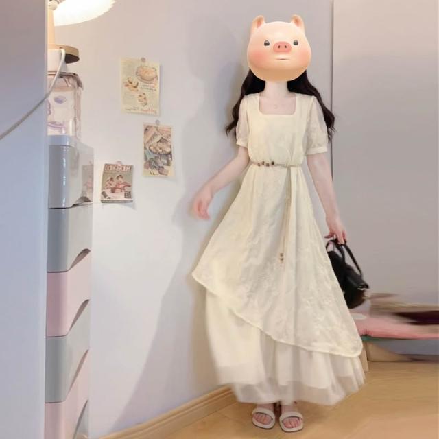全店免關稅-DM 實拍大碼女裝夏季法式重工刺繡棉布拼接網紗不規則假兩件連衣裙