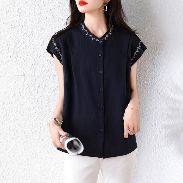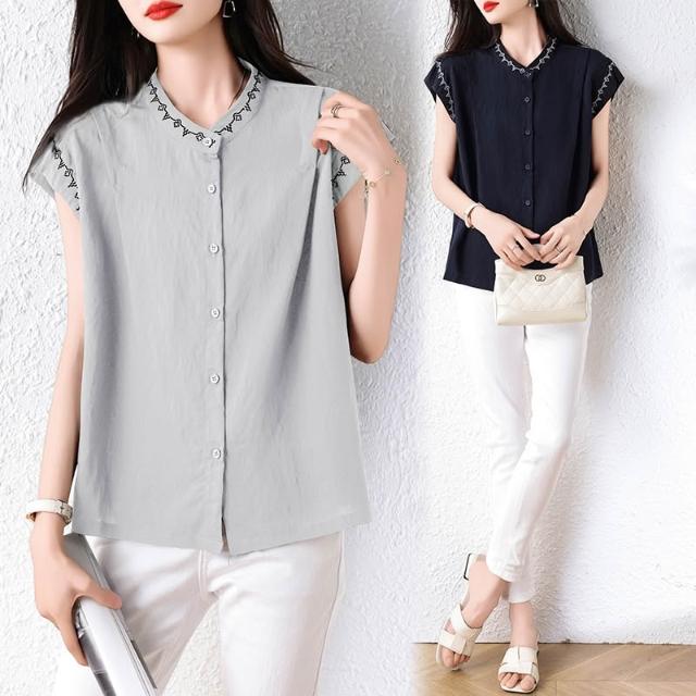 全店免關稅-DM 2025夏季新款無袖襯衫女重工刺繡外穿馬甲背心天絲苎麻氣質小衫