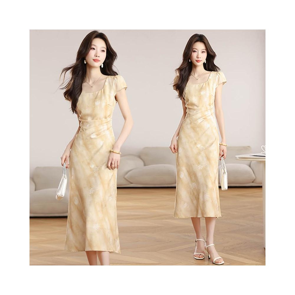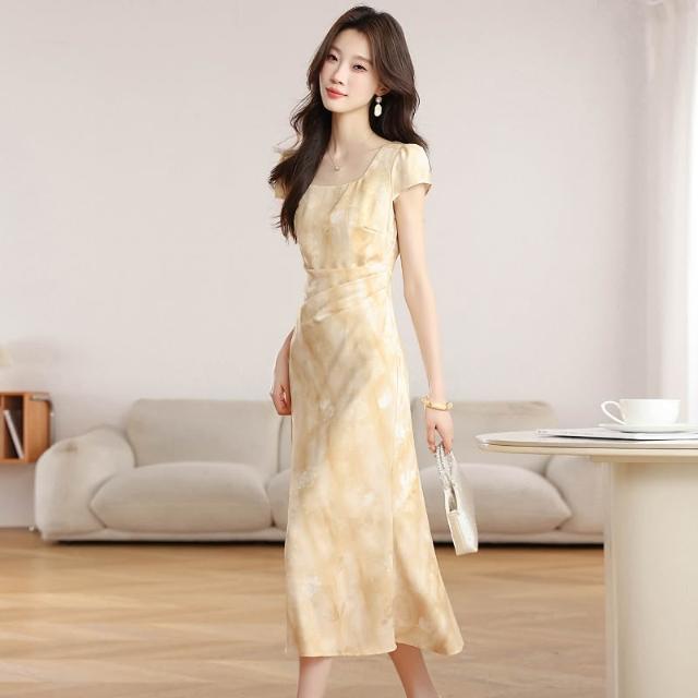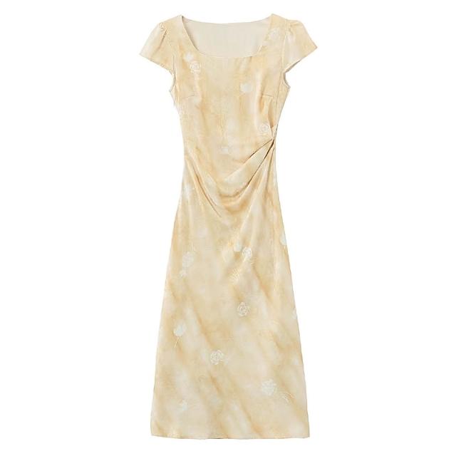 全店免關稅-DM 實拍 2026夏季新款斜裁優雅黃玫瑰黃色提花短袖連衣裙