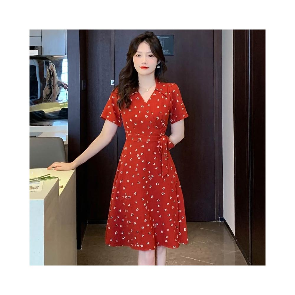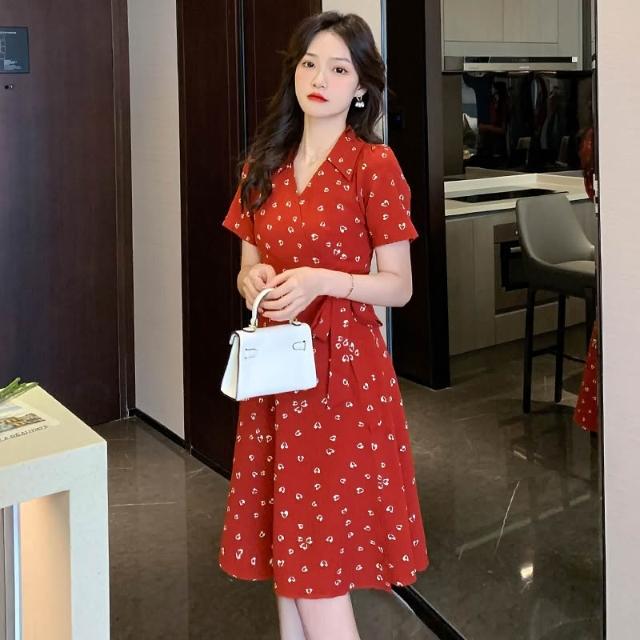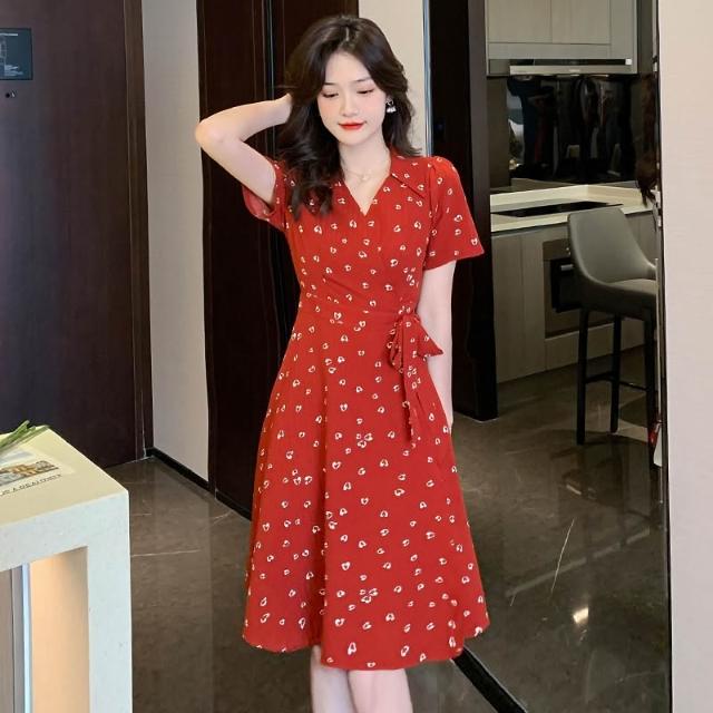 全店免關稅-DM 實拍大碼紅色連衣裙女夏梨型身材胖mm裙子顯瘦茶歇裙