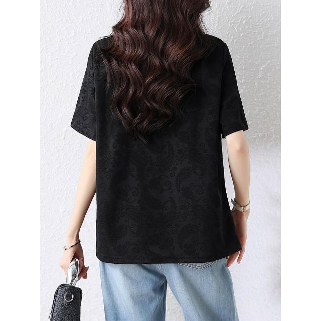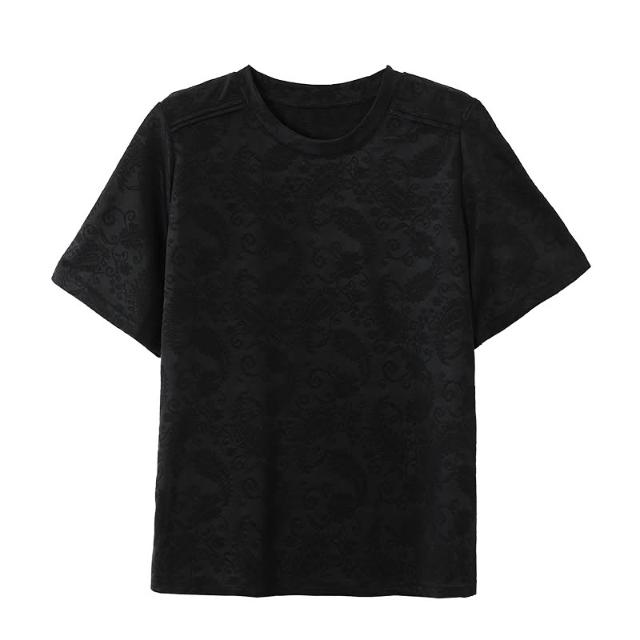 全店免關稅-DM 微胖女裝池上海棠蕾絲提花設計分割半袖T恤上衣圓領短袖