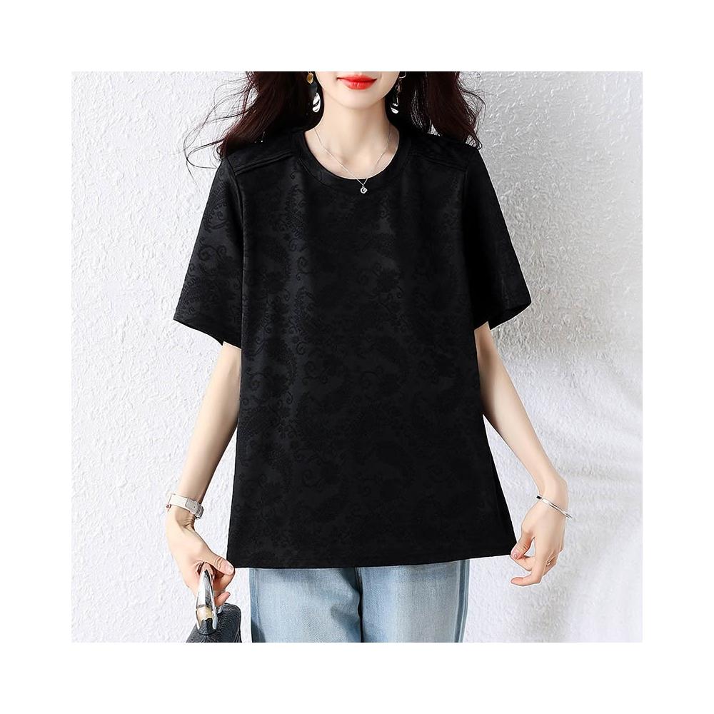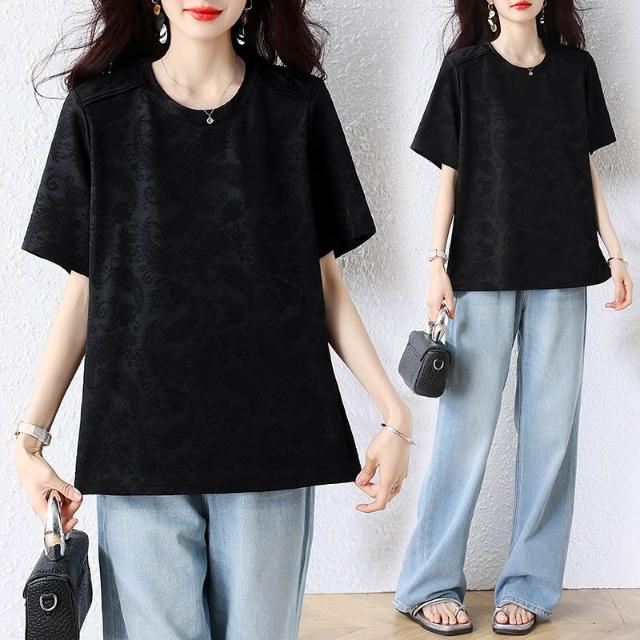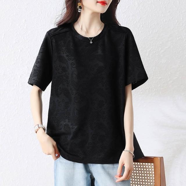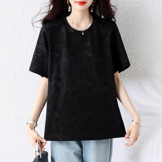 全店免關稅-DM 微胖女裝池上海棠蕾絲提花設計分割半袖T恤上衣圓領短袖