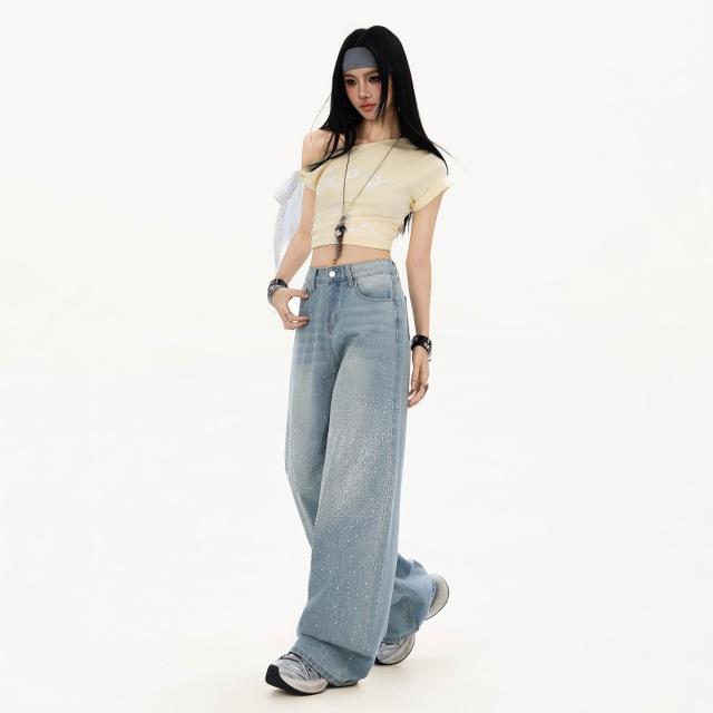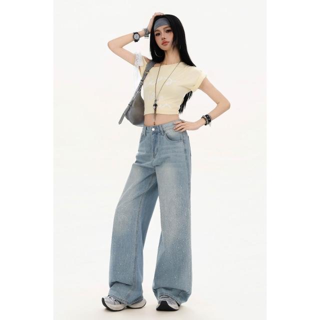 全店免關稅-DM 滿天星燙鉆牛仔褲女闊腿寬松2026夏季新款小個子淺色窄版直筒褲子