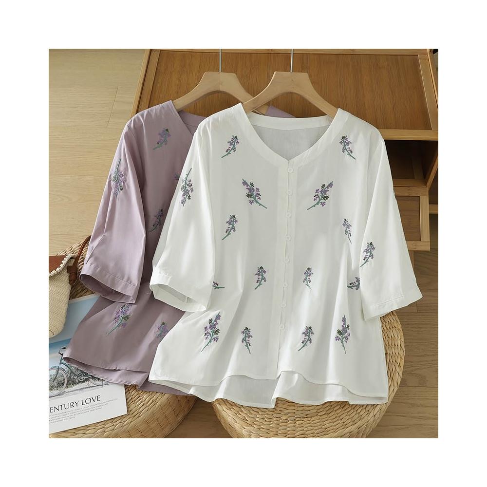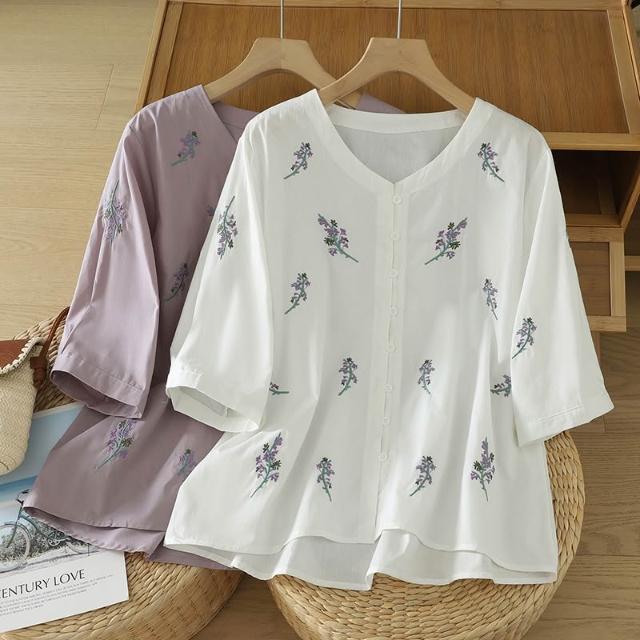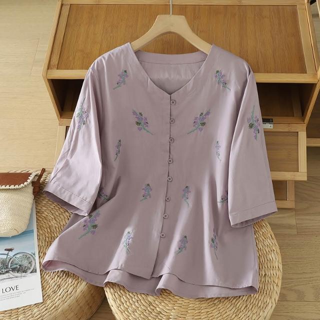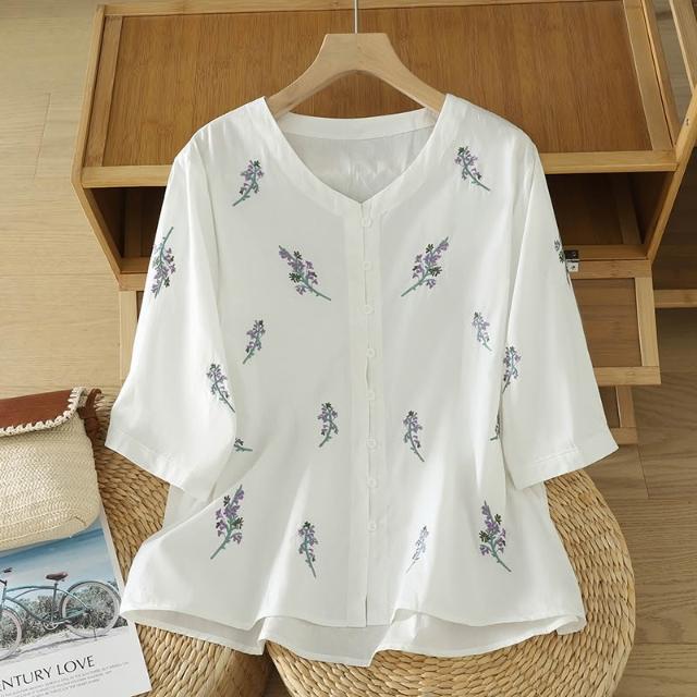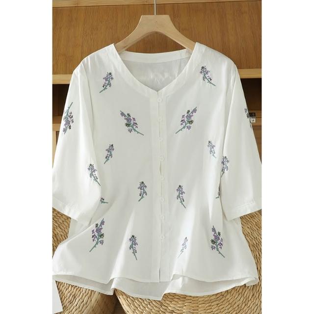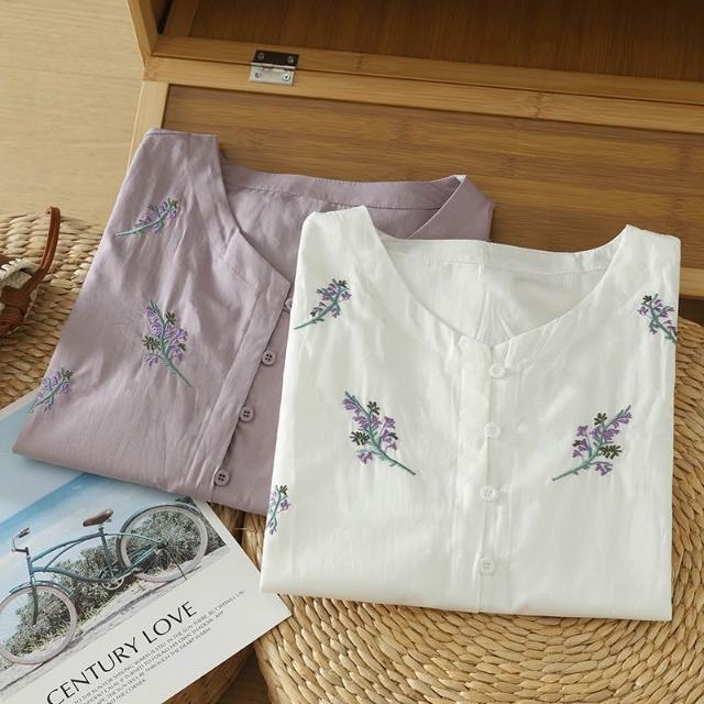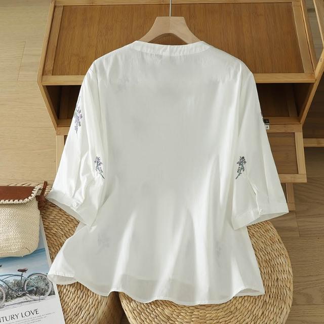 全店免關稅-DM 實拍棉麻襯衫女五分袖夏季V領新中式刺繡開衫襯衣寬松百搭