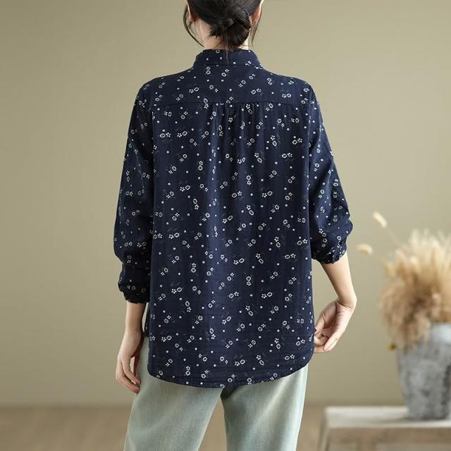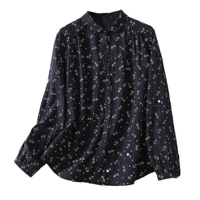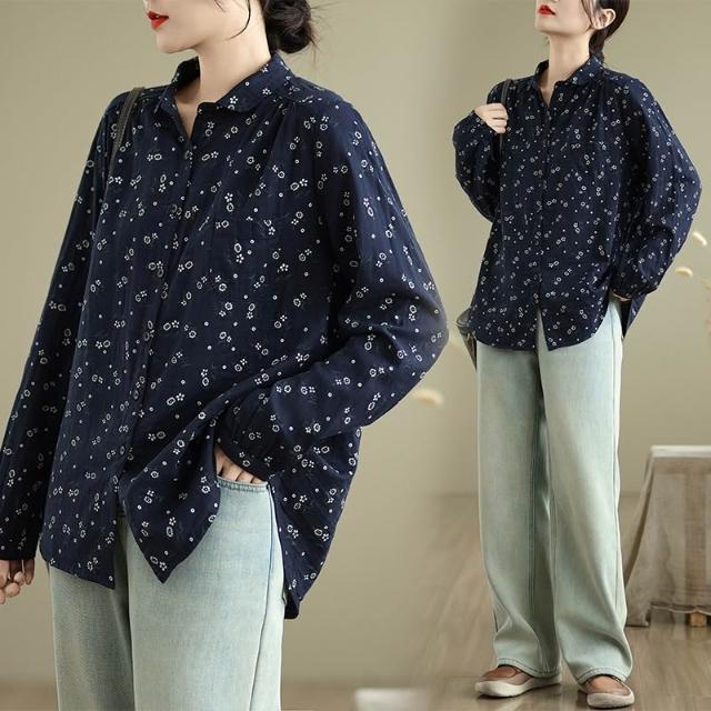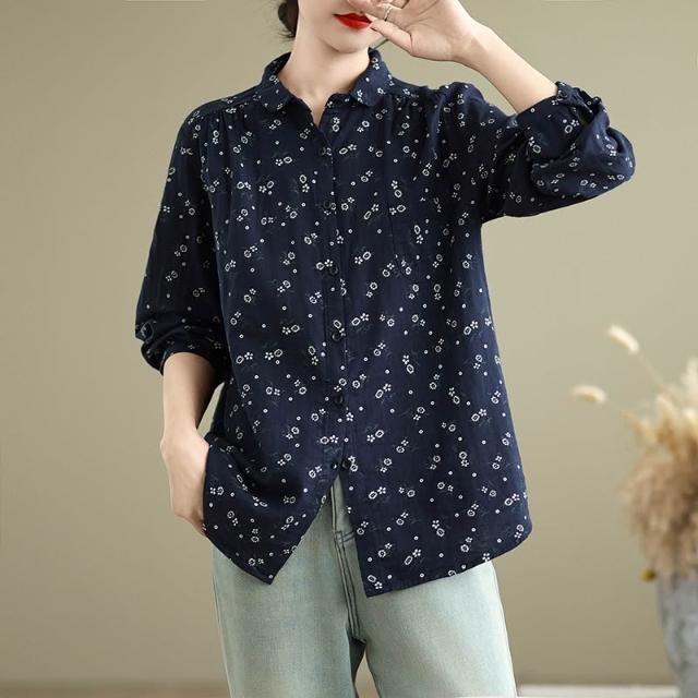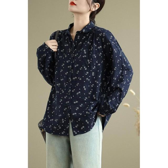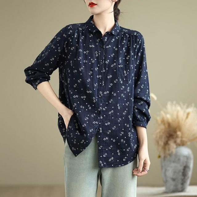 全店免關稅-DM 實拍小碎花雙層棉紗長袖襯衫女寬松春秋復古文藝休閑打底襯衣