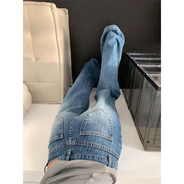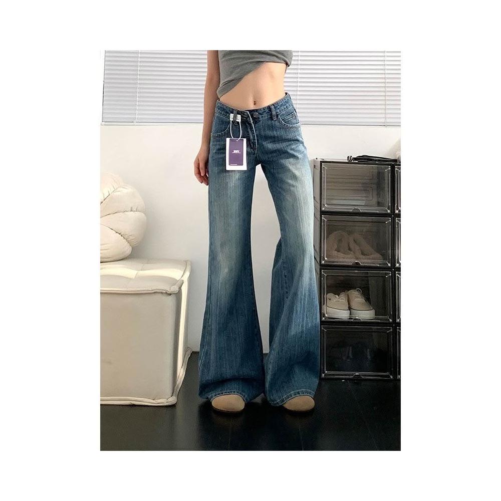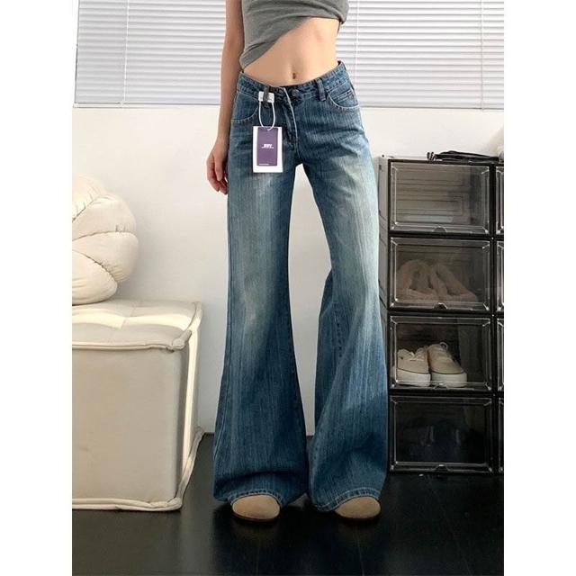 現貨供應~~美式辣妹復古水洗微喇闊腿牛仔褲女低腰寬松喇叭拖地褲 全店免關稅-DM