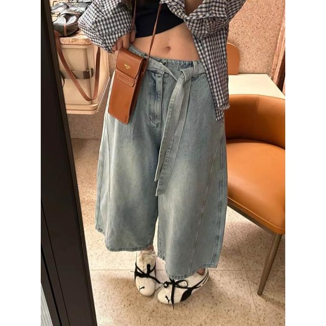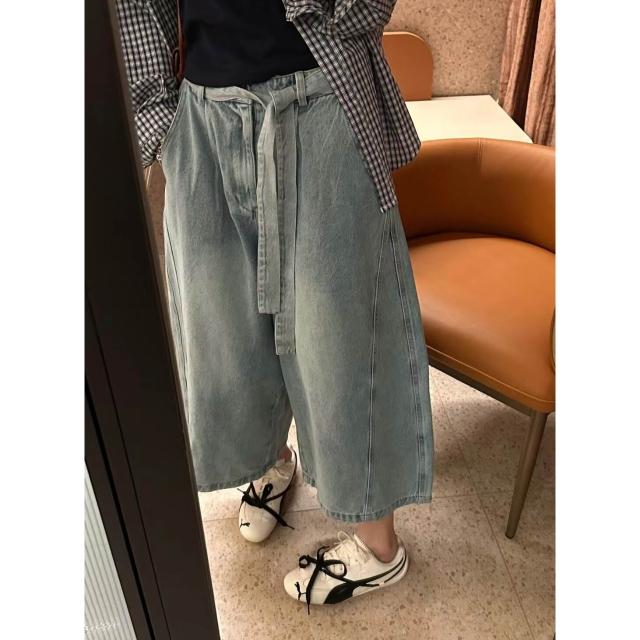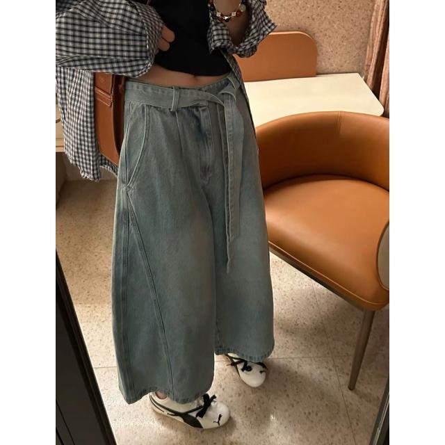 韓系顯瘦腰帶寬松遮肉八分闊腿褲2026春新設計感百搭牛仔褲女潮 全店免關稅-DM