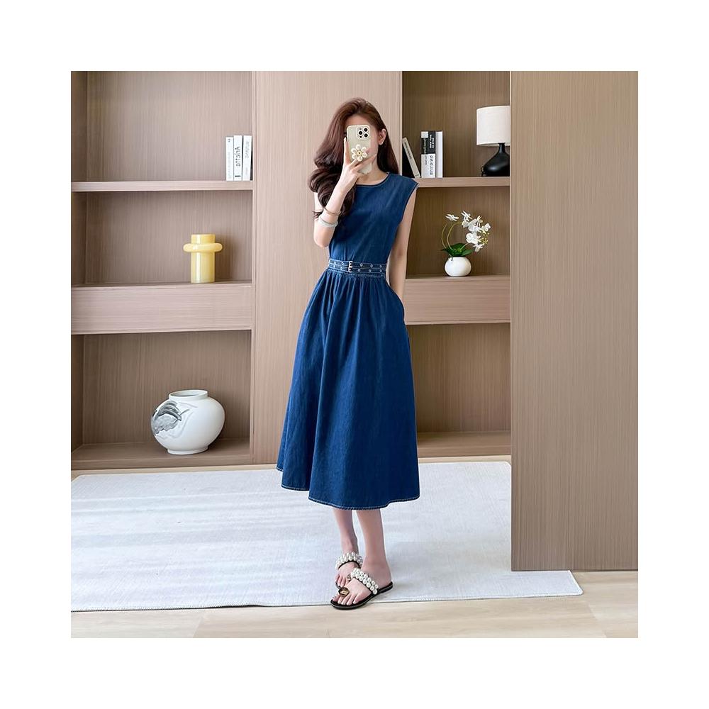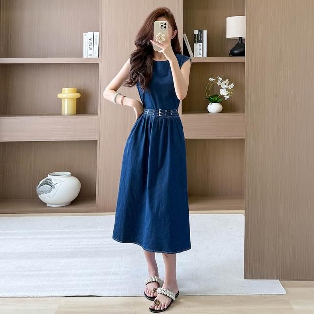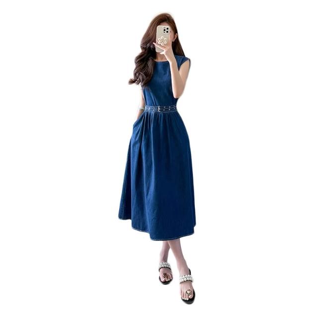 實拍有貨夏季牛仔連衣裙長裙無袖高腰寬松顯瘦腰帶