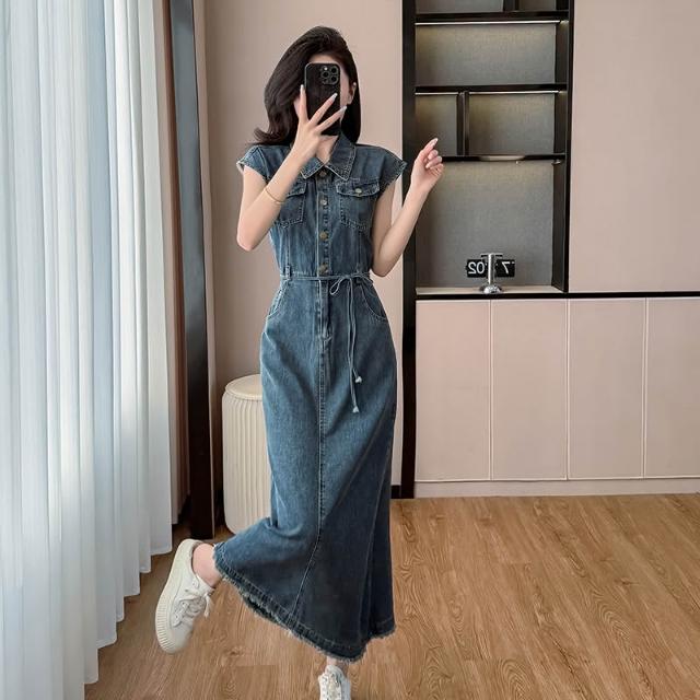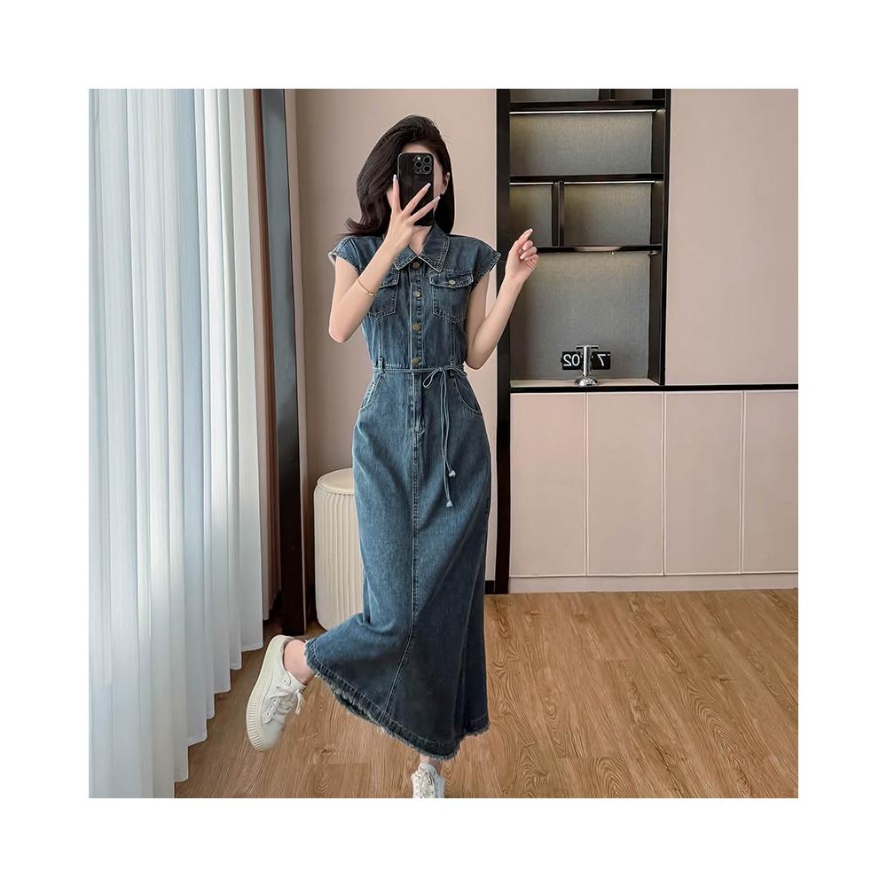 實拍有貨夏季新款港味牛仔連衣裙小飛袖無袖長裙綁帶露腰