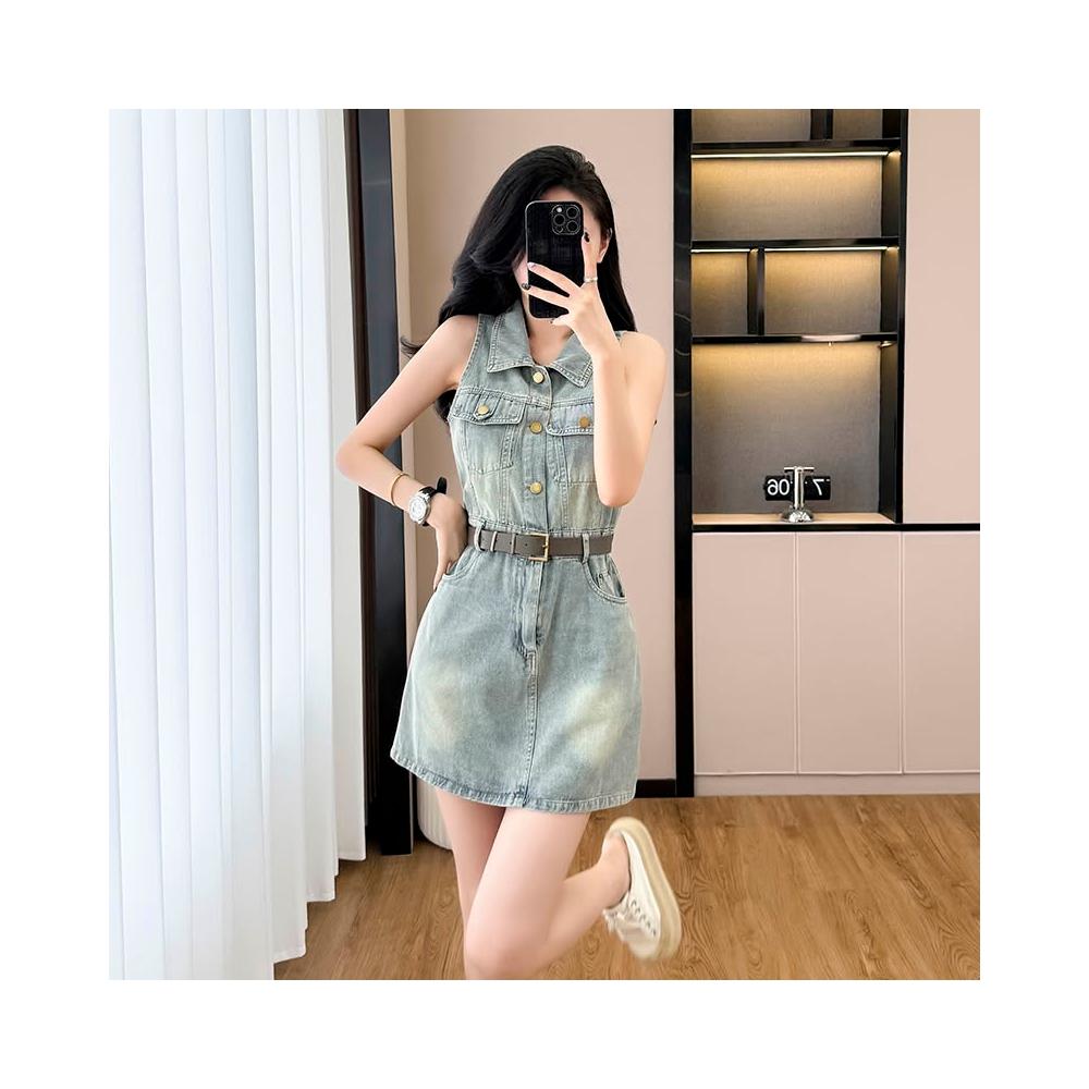 實拍夏季清涼無袖牛仔連衣裙掛脖小個子高級感a字高腰