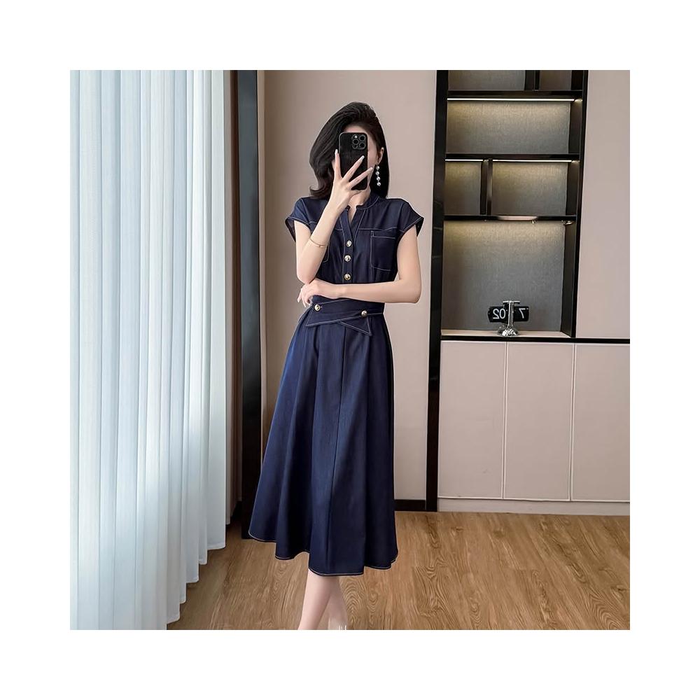 實拍夏季新款牛仔連衣裙女收腰顯瘦氣質通勤中長裙子短袖