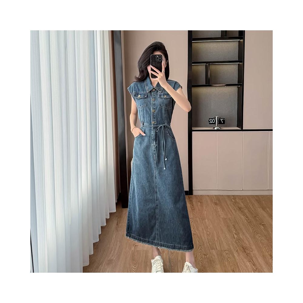 實拍夏季新款港味牛仔連衣裙小飛袖無袖長裙綁帶露腰