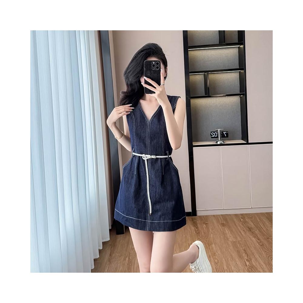 實拍2026夏季新款V領無袖背心連衣裙牛仔短裙收腰顯瘦